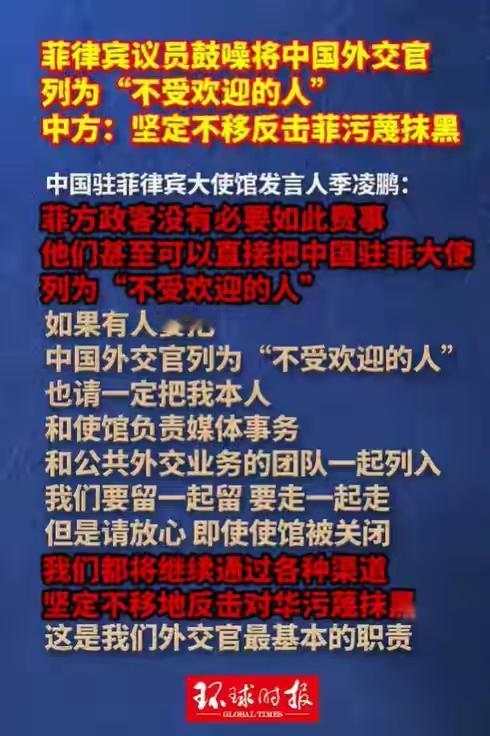 对付菲律宾的无理取闹,东大不再含蓄! 1月28日,菲律宾15名参议员共同签署了一份涉华决议,旨在把大使馆副发言人因“不具备职业操守”列为“不受欢迎的人”。 2025年12月25日,中国海军174舰在南海巡航时,发现一艘菲律宾渔船因故障漂流三天,船员濒临脱水。中方立即提供食物饮水,并协调菲海警接回渔民。 这本是再普通不过的人道救援,菲海警发言人塔里埃拉却公开指责这是“政治宣传”。类似戏码在2026年1月23日再度上演——中国海警在黄岩岛附近救起一艘倾覆货轮上的17名菲籍船员,塔里埃拉仍以同样理由抹黑。连续两次“恩将仇报”,暴露出菲方部分势力试图通过制造对立转移国内矛盾的险恶用心。 菲律宾政客的表演远不止于此。2026年1月,中国驻菲大使馆在社交媒体连续发声,反驳菲国家海事委员会及塔里埃拉等官员关于南海问题的错误言论。 这本是外交层面的正常交锋,却成为参议员们发起决议的“依据”。他们声称中方发言“贬损菲官员”,却对菲方长期在南海的挑衅行为、对中国渔民的粗暴驱离只字不提。这种“只许州官放火”的双重标准,让国际社会看清了谁才是南海和平的破坏者。 面对这场精心策划的闹剧,中方回应堪称“四两拨千斤”。中国驻菲大使馆发言人季凌鹏直接点破关键:根据《维也纳外交关系公约》,只有菲总统马科斯有权宣布外国外交官为“不受欢迎的人”,参议院无权越俎代庖。 更妙的是,他顺势将球踢回菲方半场:“若总统真要这么做,大使会立即离任,且以此为荣。”这番回应既守住外交底线,又揭露了菲政客“拿鸡毛当令箭”的荒诞——他们连最基本的外交程序都不懂,却妄图通过政治操弄向美国表忠心。 菲方此举背后,美国身影若隐若现。自2025年美国副总统哈里斯访菲以来,华盛顿不断向马尼拉灌输“依靠美国对抗中国”的幻想。 其推出的“妙手项目”更直接出资培训菲海岸警卫队,教他们如何剪辑中国执法画面、在社交媒体炒作“中国威胁论”。 美国的目的很明确:将菲律宾打造成牵制中国的棋子,至于棋子是否会变成“弃子”,根本不在考虑范围内。 菲政客们似乎忘了,当他们在南海挑衅时,中国对菲投资已远低于其他东盟国家,两国直航航班从每周300多班锐减至84班,人员往来从300多万骤降至30万——这些经济代价,最终都要由菲律宾民众承担。 更值得玩味的是,就在参议员们签署决议前一周,菲律宾外交部刚宣布对中国公民实施14天免签政策,声称要“促进贸易、投资和旅游”。 这种“一边砸锅一边吃饭”的矛盾行为,暴露出菲政府内部在涉华政策上的严重分裂。部分势力试图通过极端手段捞取政治资本,却忽视了中菲经贸合作对菲律宾经济的重要性——中国连续多年是菲最大贸易伙伴,2025年双边贸易额仍达800亿美元,菲方每闹一次,这道经济纽带就松一分。 中方此次强硬回应,实则划出一条清晰红线:核心利益不容侵犯,外交尊严不容玷污。季凌鹏那句“要列就把整个使馆一起列”,既是威慑,也是警示——若菲方执意将外交关系推向悬崖,中方必将奉陪到底。 这种态度转变,与过去“给台阶、给空间、给机会”的策略形成鲜明对比,反映出中国对菲政策从“战略忍耐”向“主动管控”的升级。 菲律宾政客的闹剧终会收场,但南海局势的走向仍取决于各方选择。东盟国家已用行动表明态度:2024年东盟外长声明重申“全面有效落实南海各方行为宣言”,明确反对外部势力干预。 菲律宾若继续充当美国马前卒,不仅会失去地区国家的信任,更可能错失与中国合作的历史机遇。毕竟,在南海问题上,谁在维护和平,谁在制造动荡,国际社会看得清清楚楚。 那么,对于这件事,大家有什么看法?欢迎大家在评论区进行讨论。