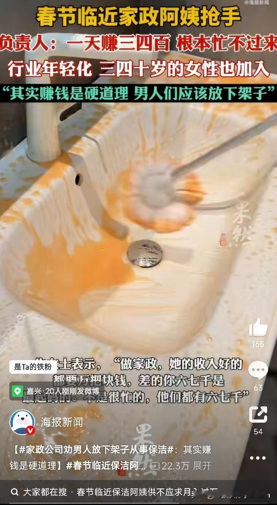 临近春节,保洁阿姨抢手 浙江嘉兴一家家政公司负责人朱女士透露,公司110多个阿姨根本忙不过来,完全“不够用”。另一家公司沈女士则表示,保洁时薪已到60元,越靠近春节可能涨到65元。阿姨们每天工作七八个小时,日收入三四百元是常态。 “做得好月入过万很普遍,就算接单少的,每月六七千也是保底。”朱女士说。收入明明白白摆在这里,但有个现象很扎眼:这行几乎看不到男性报名。 “其实赚钱是硬道理,男人们应该放下架子。”朱女士这句话,说到了点子上。 观念该变变了!保洁不是“没面子”,而是“有里子”。 很多人还觉得保洁是阿姨们的专属工作,男人干这个“丢份”。但看看现实:收入稳定且可观,时间相对自由,随着精细化收纳、高端保洁需求增长,这已经是一门有专业技巧的服务工种。 况且,擦窗、搬运、清洗抽油烟机等需要体力的项目,男性反而有优势。 春节前“黄金档”,机会就在眼前, 现在正是需求最旺、单价最高的时候。与其观望犹豫,不如抓住这波行情。靠自己的劳动挣钱,养活家庭、改善生活,这才是最大的体面。 放下无谓的架子,攥紧实在的票子。职业不分贵贱,能踏踏实实赚到钱、让家人过得好,就是本事。 (文章素材来自海报新闻,侵删)
