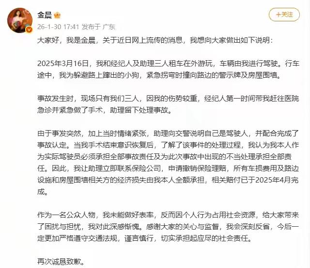 2025年3月,女明星金晨因交通事故引发关注,其实她的反应是正常人的反应,没有必要过度关注和责备。据报道,她在驾驶中为避让犬只发生事故,因伤势较重离开现场,后由助理顶包。警方调查后确认她为实际驾驶人,事故涉及车辆及路边设施受损,车内人员轻微受伤。金晨随后发文道歉,表示将承担全部责任并撤销保险理赔,相关赔付已在2025年4月完成。演员金晨,1990年9月5日出生于山东济南,毕业于北京舞蹈学院民族舞专业,是中国内地的影视女演员和模特。她的演艺生涯始于2011年,因出演武侠剧《七种武器之孔雀翎》进入演艺圈,同年还参加了舞蹈节目《舞动奇迹》并获得总冠军。之后她主演了多部电视剧和电影,如《无心法师》、《萌妃驾到》、《隐秘而伟大》、《孤注一掷》等,凭借出色的表演获得了多项荣誉。