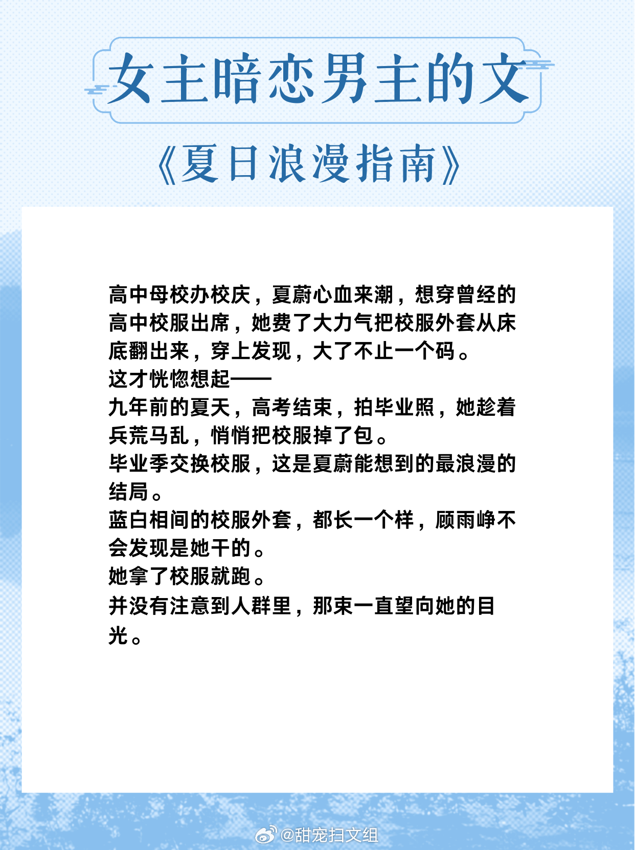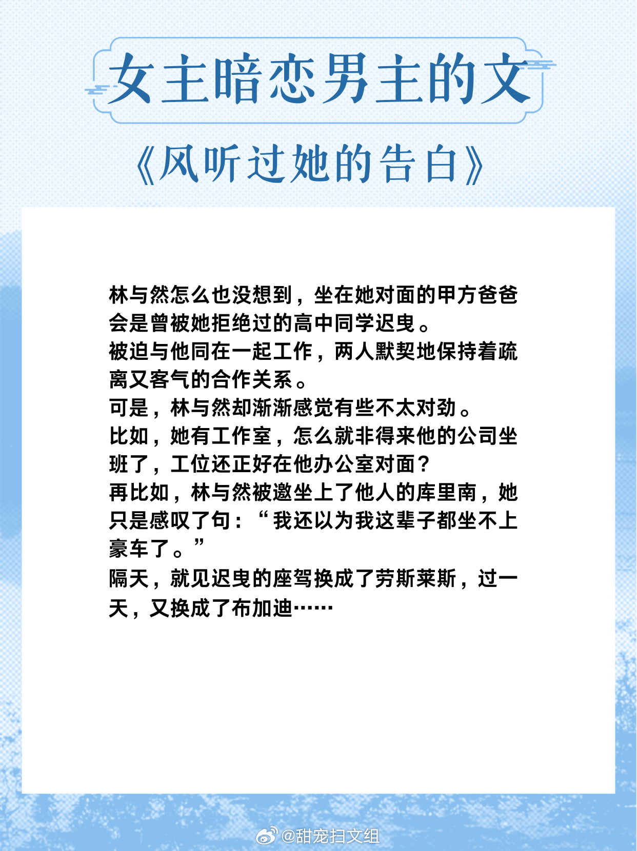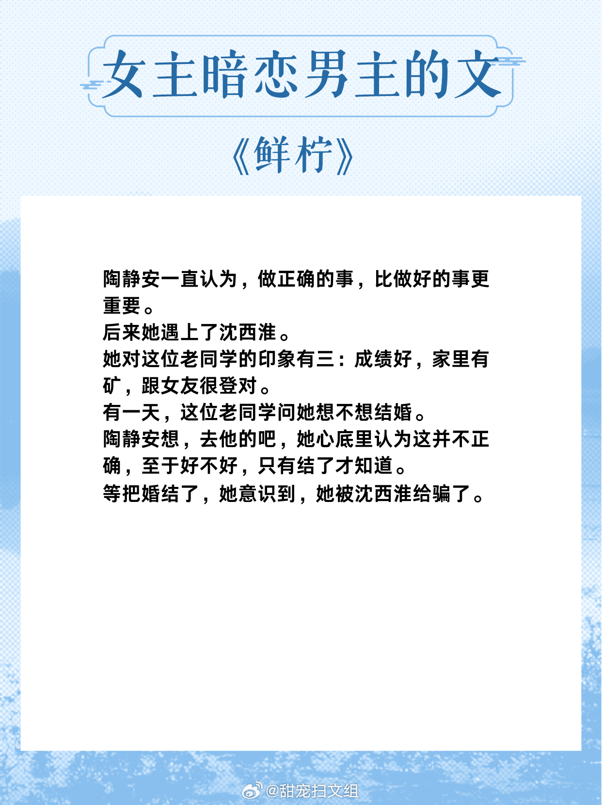 女主暗恋男主的文,男主不知道,自己醋自己!当你悄悄的时候,他也悄悄1、《风听过她的告白》作者:默语书白2、《他也悄悄》作者:本萝北3、《冬禧日记》作者:一枚柚4、《暗恋有回音》作者:花间佳酿5、《第三十二封情书》作者:丹青手6、《像鱼》作者:澄礼7、《夏日浪漫指南》作者:拉面土豆丝8、《鲜柠》作者:一张小纸片9、《坏情书》作者:来恰酒这小说写在我心趴上了 越读越上头的小说神作