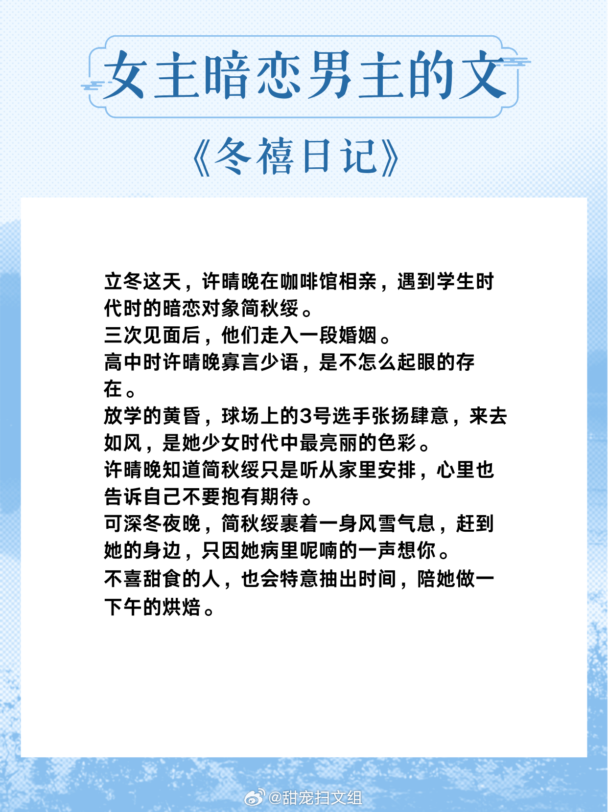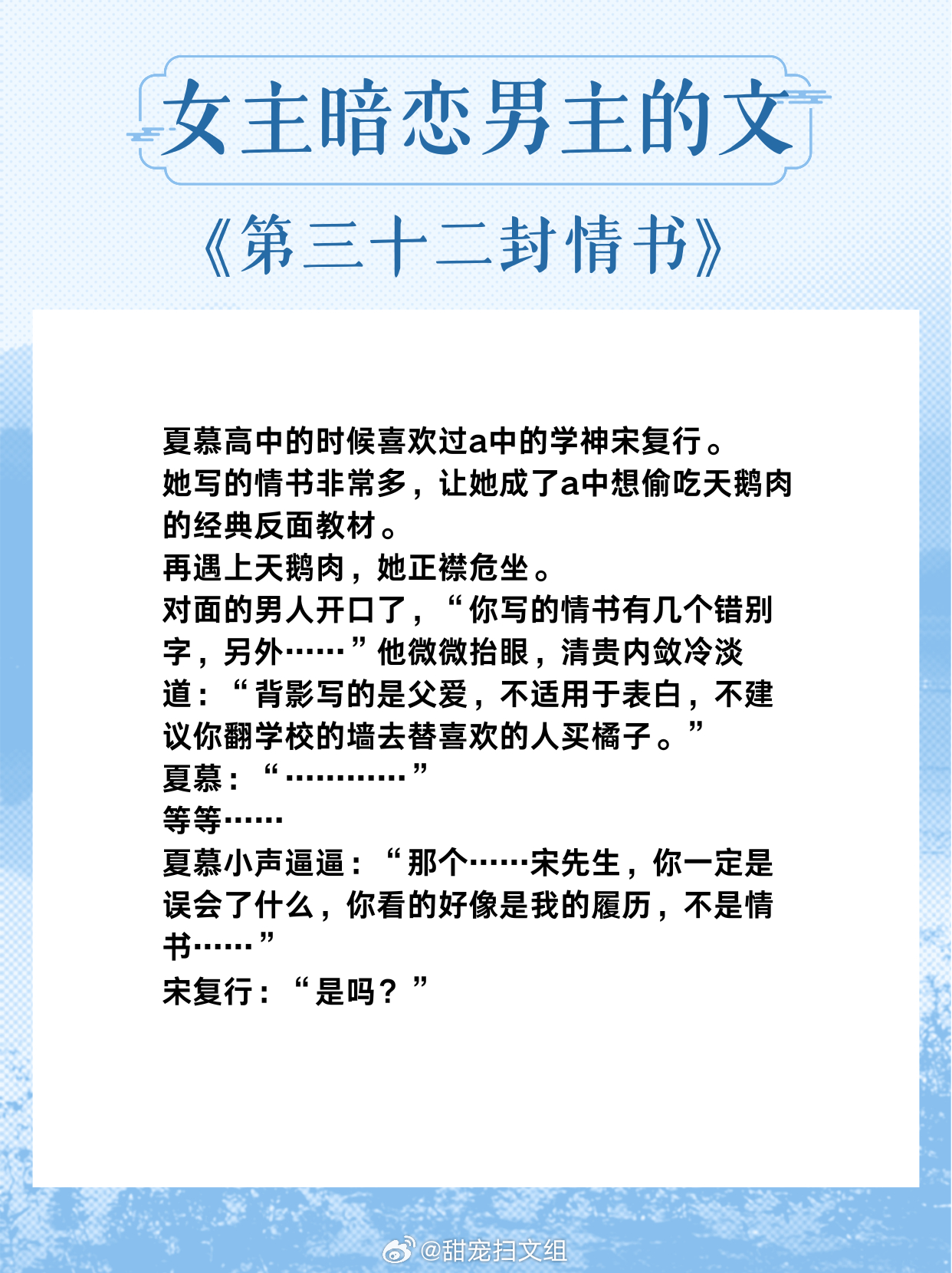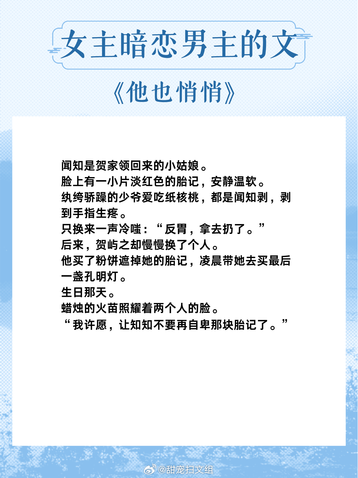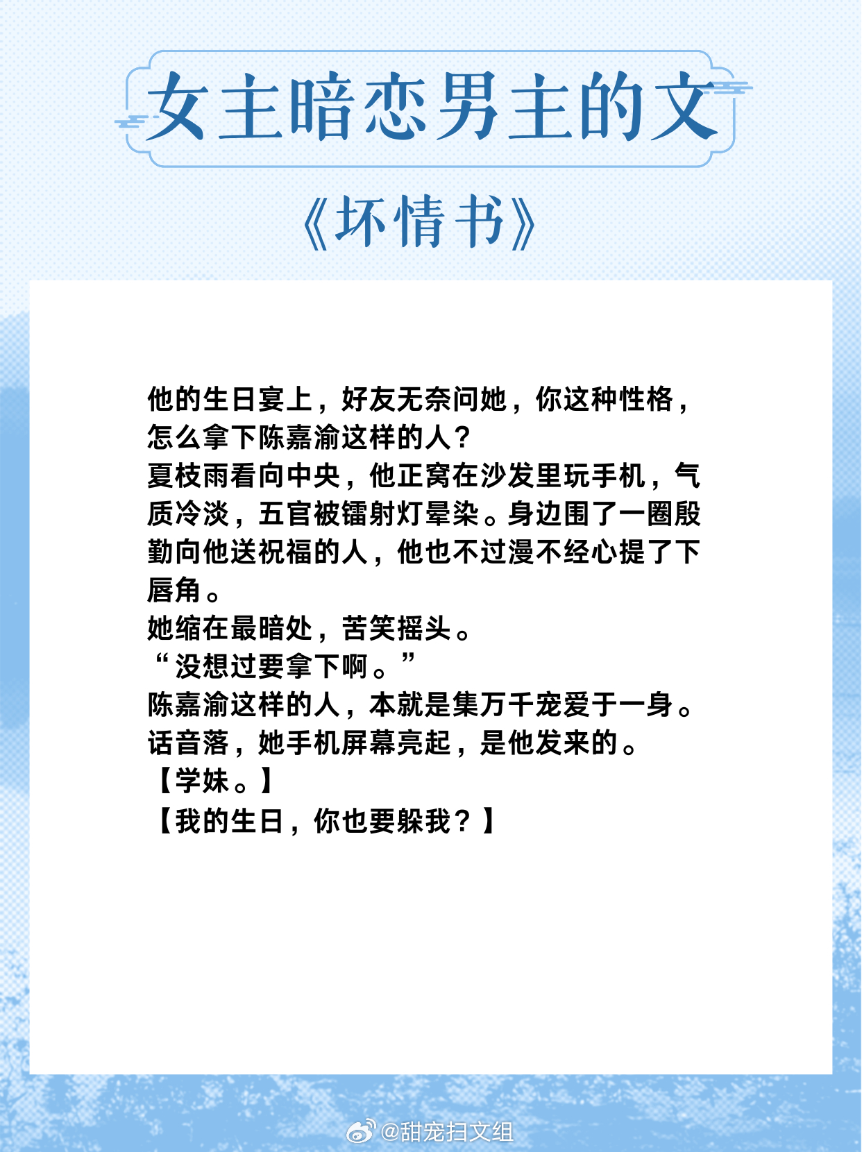 女主暗恋男主的文,男主不知道,自己醋自己!当你悄悄的时候,他也悄悄1、《风听过她的告白》作者:默语书白2、《他也悄悄》作者:本萝北3、《冬禧日记》作者:一枚柚4、《暗恋有回音》作者:花间佳酿5、《第三十二封情书》作者:丹青手6、《像鱼》作者:澄礼7、《夏日浪漫指南》作者:拉面土豆丝8、《鲜柠》作者:一张小纸片9、《坏情书》作者:来恰酒这小说写在我心趴上了 越读越上头的小说神作