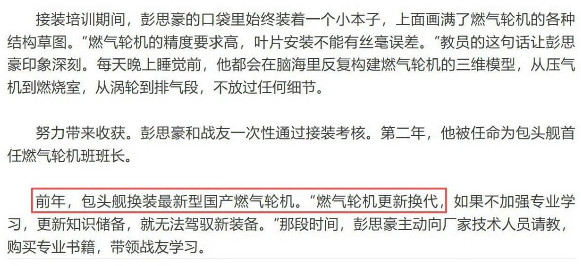 动力系统是军用舰艇的“心脏”,小到最简单的舰内照明,大到让数千吨乃至数万吨级舰艇实现高速航行,以及为林林总总的船电系统持续供电等,都取决于动力系统的整体性能。而今,在国产CGT-25M舰用燃气轮机已达世界一流水平,且装机量很可能仅次于美国的LM-2500系列,即成为“世界第二”的当下,新型国产舰用燃气轮机的消息也出现了,可谓是意义斐然。 在解放军报于近期发表的一篇名为《军营观察丨水兵们的“航海日记”》的文章中,出现了有关国产导弹驱逐舰“包头舰”换装最新型国产燃气轮机的消息。从报道中给出的时间点来看,身为国产052D系列“中华神盾”驱逐舰第33号舰的“包头舰”,于前年换装了“最新型燃气轮机”,事情显然就不简单了。要知道,“包头舰”是一艘“成色很新”的军舰,于2019年下水,2022年正式服役,今年是其进入服役生涯的第四个年头。若以当下的2026年来想,该舰于前年换装最新型国产燃气轮机,即意味着该舰是在2024年进行的相关工作。 考虑到此前曾有传闻称,国产新一代燃气轮机CGT-30系列中的舰用型号,即CGT-30M的主机整体尺寸和结构,基本可实现与现有的CGT-25M的“原位替换”。故我们有理由相信,“包头舰”就是以这种方式将原有的CGT-25M,换为了额定功率提高到33.5兆瓦、热效率高达39.3%的CGT-30M。可以说,这已经赶上了最新型的美制LM2500-G4型舰用燃气轮机的水准,是不折不扣的“全球第一梯队水平”。 热效率更高,意味着CGT-30M的燃油经济性更好,可在同等航行条件下实现省油效果。而额定功率的提升,则意味着CGT-30M可用于驱动更大吨位的舰艇,抑或是让同等吨位下的舰艇来到更快的航速水平,以及实现更强的供电效果。仔细想来,“包头舰”属于052DL型舰,舰体尺寸略大于此前的052D型,满载排水量被认为增加了约800吨,来到了约7000吨级的水平。不排除该舰换装CGT-30M,是为了维持航行机动性不下降。 当然了,一种更大的可能性在于,“包头舰”是在以试验舰的身份对CGT-30M进行实际装舰测试,通过长时间的使用和运转来验证CGT-30M的各类性能,从而为未来以CGT-30M为主动力系统的国产新型舰艇进行“探路”。通常来说,每当有额定功率显著上一个台阶的新型舰用燃气轮机诞生时,其往往会对应某款全新舰艇的出现。新型舰艇会在平台排水量和综合作战效能等方面,对现有型号表现出质的提升。 这样想来,CGT-30M显然更像是对应传闻已久的国产9000吨级通用驱逐舰而生的产物。关于9000吨级通驱,有人认为其会是放大版的052D,沿用052D系列驱逐舰现有的船电系统,适当提升垂直发射单元的尺寸和数量,以容纳部分新型舰载弹药。但也有人认为,9000吨级通驱或将是“小号055”,搭载双波段舰用相控阵雷达,以及可容纳2架舰载直升机的机库。如若第二种猜测更加准确,那堪称豪华的船电系统显然就需要更加充裕的供电能力了,不排除CGT-30M就是为此而生。 而今,“包头舰”使用新型燃气轮机已有约3年时间,官方于此时对这件事进行曝光,或说明CGT-30M的表现颇为良好,甚至是完全达到了大规模装舰的要求。这是否意味着9000吨级通驱就快要出现了呢?不知各位怎么看。