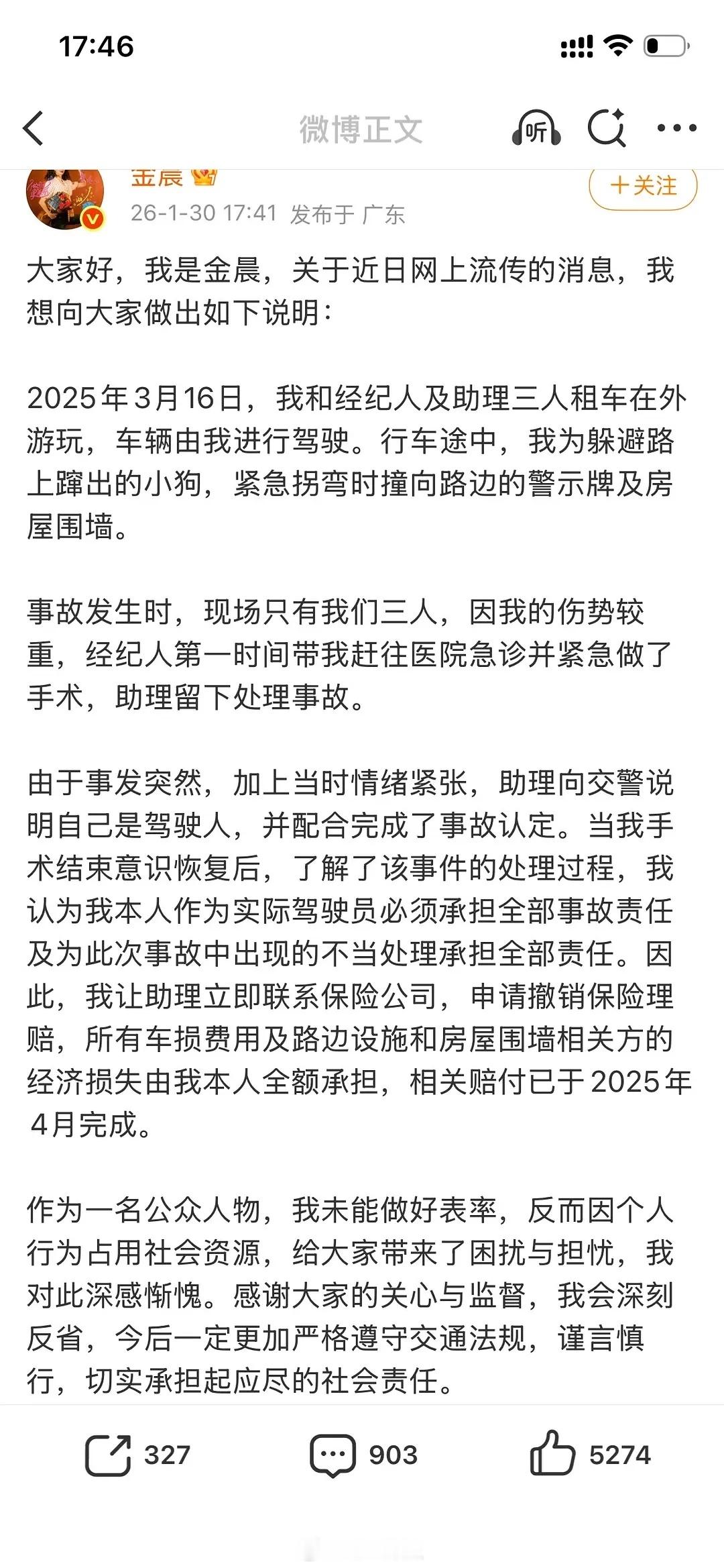 金晨发微博说是助理当时太紧张了所以在她不知情的情况下跟👮说自己是驾驶员警方通报