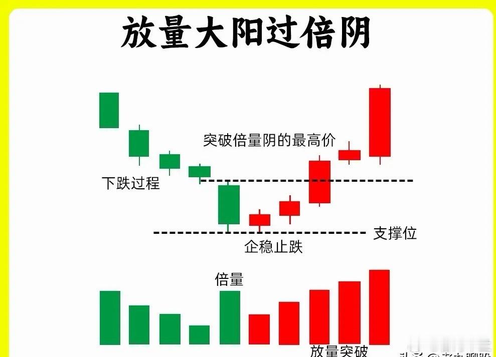 注意了!趋势反转是散户最为薄弱的环节,不管是股价在底部还是涨势的初期中回档。今天就给大家分享一个趋势变化的形态,放量大阳过倍阴。这个形态的关键在于量价双强,不管是不是短线选手,这个形态一定要牢记还是老规矩,点赞收藏或评论888支持一下,我每天分享炒股干货,以免以后想温习找不到了一、股价在下跌趋势的末期或是上涨趋势的回调过程里,出现这种形态二、股价在整个下跌过程里,出现一个中大阴线,同时成交量出现放大,比最近的成交量都要大。之前的成交量会出现逐步缩量,到末尾反而出现放倍量的阴线。其实这是主力的一种洗盘手法,测试下方的承接力量。三、随后,股价并没有继续下跌,而是开始止跌向上。四、股价反弹到中大阴线附近,出现一个倍量的中大阳线,如果是涨停板就最佳,从股价和成交量来说,都比中大阴线要大,就形成股价和量的双覆盖需要我们注意的是,倍量阳的有效性,能持续有量,而不是放量的次日开始缩量好了!这个形态就这么四个核心要点,下方我准备了实盘案例,建议文章和案例结合起来看。希望对大家有启发和帮助,也是最为基础的内容,一定吃透。我们下期内容再见