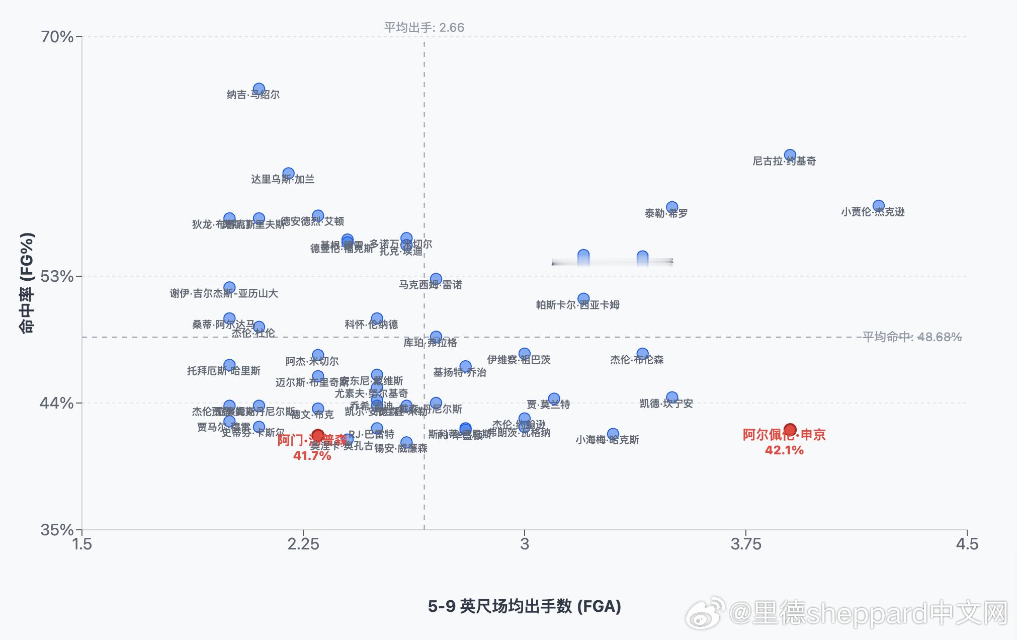 图2,是5-9英尺的距离出手命中率:申京42.1%联盟第45阿门41.7%联盟第48(这部分需要的是抛投/勾手/中投技术,慢慢打磨吧)(给出一个上古数据:08-09年姚明在5-9英尺53.9%,出手4.5中2.4,排第2,但图2中虚线可以看到本赛季53%以上球员已经很多了)