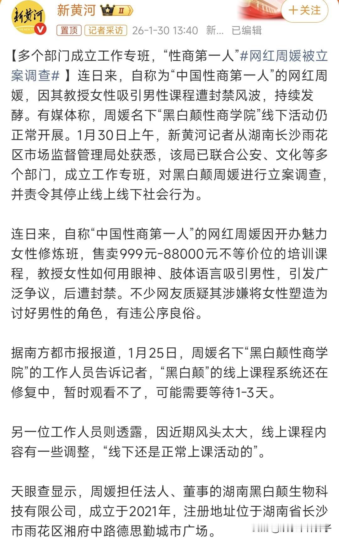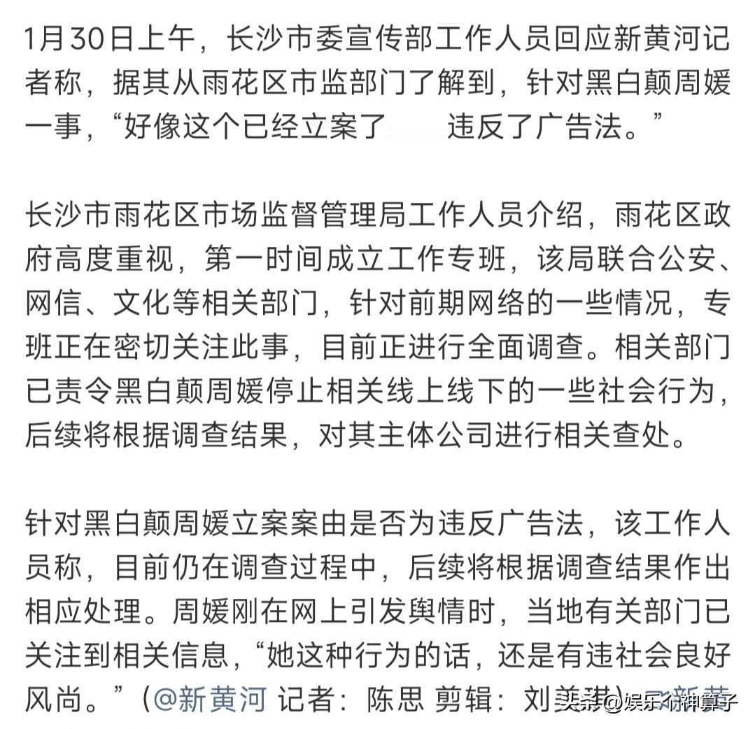 终于出手了!“性商第一人”网红周媛被立案调查 1月30日,据媒体报道,多个部门成立工作专组,对黑白颠周媛进行立案调查。消息一出,很多网友表示大快人心! 说实话,以前对这位网红并不了解,看到照片,真的有点惊讶,就这样,竟然还自称为“中国性商第一人”,好大的口气,真的不是贬低,这颜值,这打扮,跟性感一点也不搭边。 有点想不明白,真的有人会相信这种网红,并学习她教授的如何让女性吸引男性的教程? 如果传递的是正能量,能够帮助更多人,也算好事,倘若这种行为违反社会良好风尚,被立案调查,真的是大快人心。