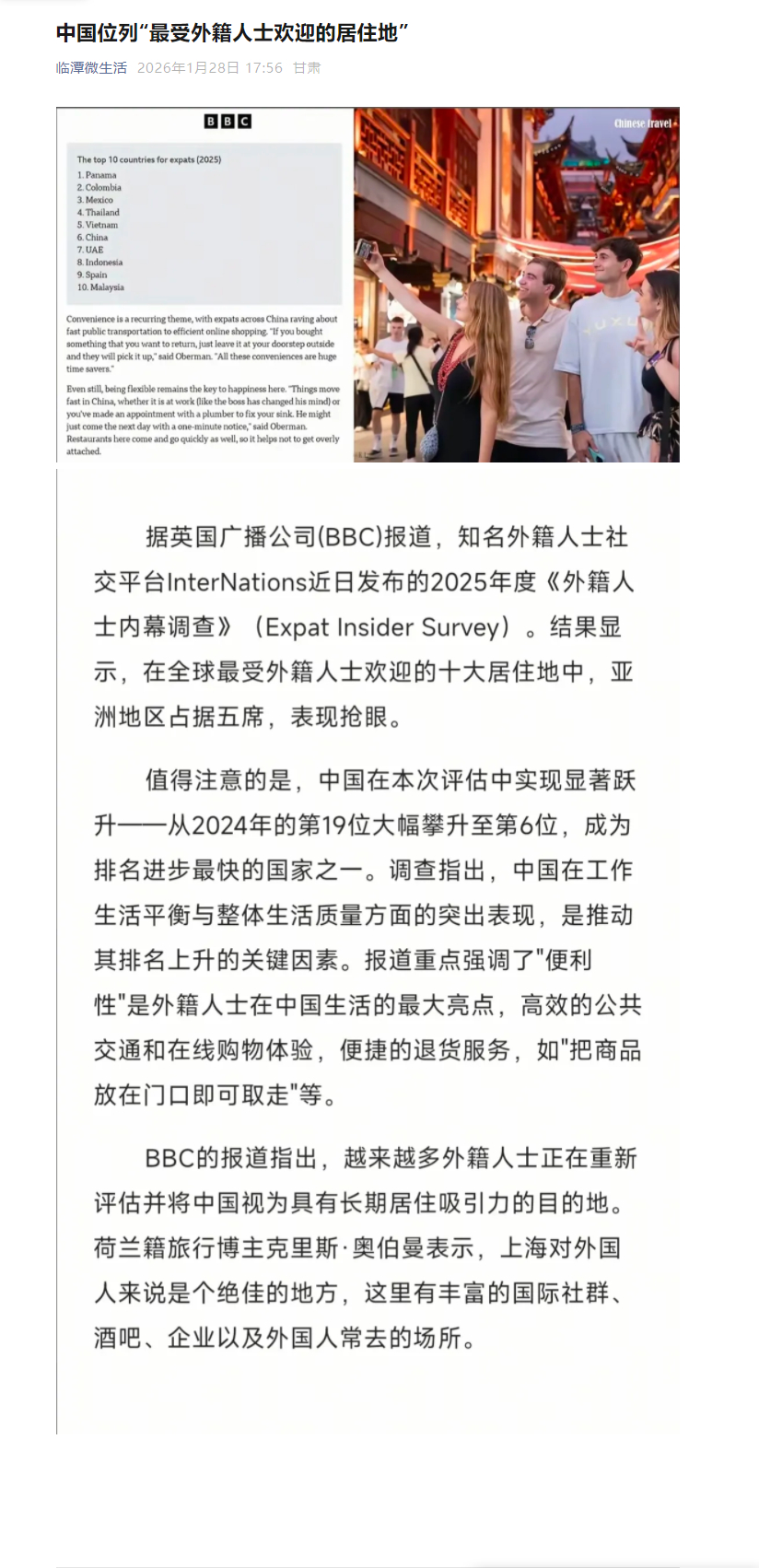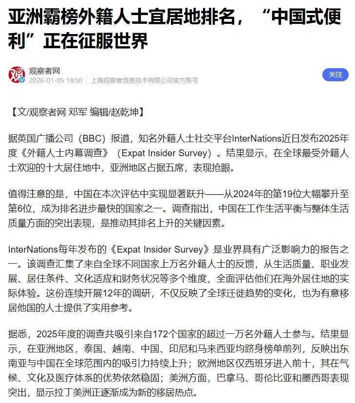 :跃居全球第六!中国式幸福感让中国成为外籍人士宜居新标杆【跃居全球第六!中国式幸福感让中国成为外籍人士宜居新标杆】 外籍人士内幕调查报告亚洲霸榜外籍人士宜居地排名全球最受外籍人士欢迎的居住地中国式幸福感 当来自172个国家的逾万名外籍人士在InterNations的调查问卷上写下对中国的认可,一份含金量十足的排名重磅出炉:2025年度“全球最受外籍人士欢迎的居住地”榜单中,中国从2024年的第19位跃升至第6位,成为榜单中攀升最快的国家。一、排名跃升背后:一份来自全球的“信任投票”InterNations的调查以其全面性与客观性著称,本次调查聚焦生活品质、职业发展、文化适应、居住便利五大核心维度,受访者涵盖跨国企业高管、数字游民、创业者等多元群体。在全球经济不确定性加剧、高通胀困扰多国的背景下,中国能实现13位的跨越式提升,绝非偶然。对比榜单可见,美国仅位列第36位,且在可负担性、医疗质量、政治稳定性等指标上评分下滑,而中国凭借均衡的综合表现,成为亚洲国家中排名前列的宜居地,与巴拿马、西班牙等传统热门目的地共同跻身前十。“这一排名变化反映了外籍人士对中国长期发展潜力的认可,更体现了他们在华生活体验的真实提升。”InterNations首席营销官Kathrin Chudoba指出,近年来亚洲国家在榜单中的强势表现,印证了“个人财务安全感”与“生活品质平衡”已成为全球人才移居的核心诉求,而中国恰好精准契合了这一趋势。从一线城市的国际化配套到二三线城市的高性价比生活,中国正以多层次的宜居生态,吸引着全球目光。二、中国式幸福感:四大维度解码宜居密码如果说排名是外在认可,那么“中国式幸福感”便是支撑这份认可的内在肌理。调查显示,受访外籍人士对中国的好评集中在四大核心亮点,共同构成了难以替代的宜居优势。生活负担可控,性价比优势凸显是外籍人士扎根中国的重要前提。与东南亚国家相比,中国的薪资水平与生活成本形成了独特的“性价比优势”——多数外籍人士表示,在华收入不仅能轻松覆盖日常开支,还能留有结余用于旅行、进修等精神消费。在北上广深等一线城市,国际化薪酬体系与完善的社会保障让专业人才无后顾之忧;而在昆明、海口、大理等二三线城市,这种优势更为突出:一套设施齐全的公寓月租仅为一线城市的三分之一,街头巷尾的平价美食、便捷的公共交通,让月薪万元就能享受高品质生活。对比泰国清迈等热门低成本宜居地,中国二三线城市在保持亲民消费的同时,更能提供更优质的医疗资源、更完善的基础设施,这种“低成本+高品质”的组合,成为吸引数字游民与退休人士的重要砝码。消费场景多元,文化底蕴深厚让异国生活充满惊喜。从北京南锣鼓巷的冰糖葫芦到上海外滩的米其林三星餐厅,从西安的古城墙到成都的太古里,中国的消费场景兼具烟火气与国际化。外籍人士普遍表示,中国的餐饮娱乐不仅满足味蕾需求,更承载着文化体验——在夜市摊档品尝地道小吃,在茶馆感受传统茶艺,在文创园区体验非遗手作,这种多元融合的消费生态,能适配不同文化背景、不同消费层次的需求。文化包容友善,融入门槛降低让“此心安处是吾乡”成为现实。调查显示,超过70%的外籍人士认为中国居民的友好态度是他们快速融入的关键。在昆明,村民会主动邀请语言不通的史蒂夫回家吃饭;在海口保明村,火山古村里的“新村民”们自发组织跨文化社群,不同肤色的邻居们共享美食、交流心得。“中国式便利”全球领先,生活效率倍增成为最直观的加分项。完善的基础设施与数字化生活,让外籍人士直呼“离不开”:高铁网络覆盖全国,昆明到大理只需2.5小时,海口市区到海边骑行不超过20分钟;移动支付普及到街头小贩,无需携带现金就能畅行无阻;外卖与即时配送服务,让食材、药品、生活用品“小时达”;5G网络全覆盖与跨境数据流动试点,为数字游民与外贸从业者提供了高效工作保障。斯洛伐克工程师雅恩走过100多个国家,最终选择在海南定居,“这里的基础设施比很多发达国家更完善,工作和生活能完美结合,这种便利度在全球都少见”。三、从“吸引”到“扎根”:中国宜居生态持续升级中国的吸引力,早已超越单一的生活便利,形成了“事业发展+生活品质+文化认同”的三维支撑。在海南自贸港,“双15%”税收优惠与免签政策,让雅恩的贸易公司注册仅用一周,亚瑟的医疗机器人外贸生意也借助跨境数据政策蓬勃发展;在云南,数字游民社区集聚效应初显,2025年上半年就有280.3万人在此旅居,外籍人士既能扎根乡村体验风土人情,又能依托数字基建对接全球市场;在长三角、珠三角,跨国企业与科创园区的集聚,为专业人才提供了广阔的职业发展空间,形成“以业留人、以情留心”的良性循环。