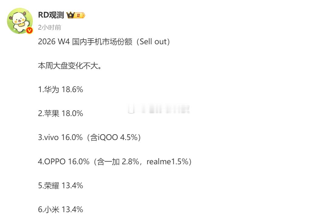 RD观测老师公布2026年第4周国内手机份额
