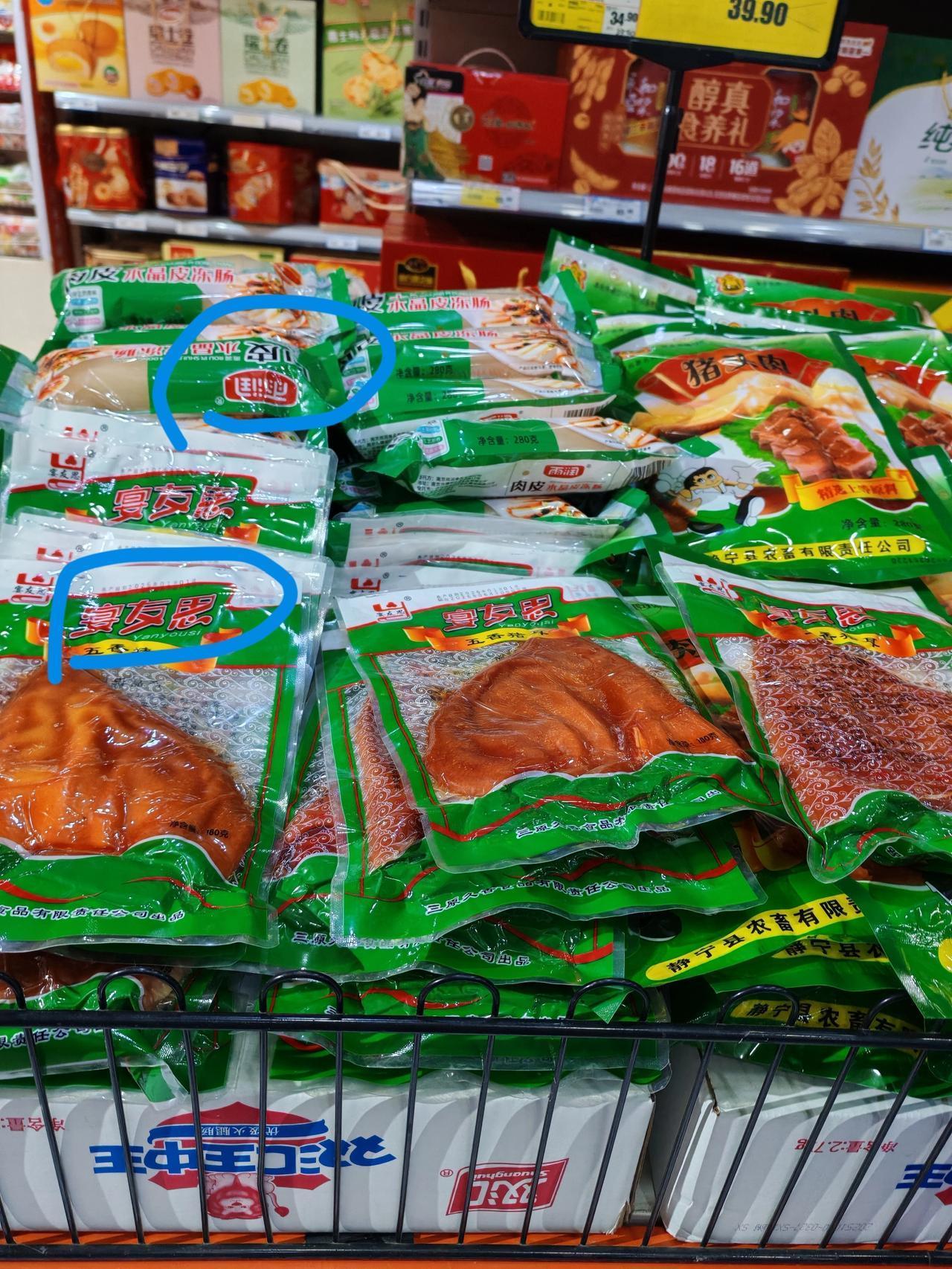 发现一个新的熟肉品牌 1月30日,坐标西安。这会儿我来到家附近的超市小转一圈,发现年味近了,不仅有了春联,窗花,红包,还有大量的肉制品上市。 除了一排排的各式蒸碗,黄焖鸡,小酥肉,甜饭,粉蒸肉,四喜丸子,还多了大量开袋即食的肉制品,烧鸡,猪蹄,猪耳朵,肉皮冻,鸡爪子等等。 这些肉制品除了家喻户晓的双汇,雨润,得利斯,还发现了小众牌子,陕西三原县的宴友思,今天又发现了一个新货,这个牌子叫“路大路”。 这是个新牌子,没听过,今天是第一次见,我拿起来看了一下(见图1),上面写着静宁路家,应该是一个来自甘肃的品牌,这个牌子的烧鸡好不好吃,不知道,以前没买过,看了一下价签,售价34.9元,不贵,就是不知道味道咋样。 你们买过这家的肉制品吗?好不好吃?