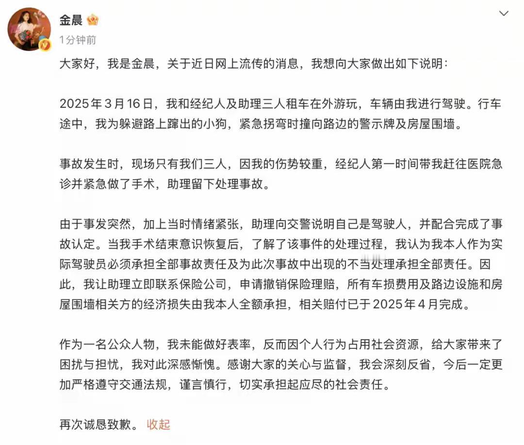 金晨涉嫌交通肇事顶包事件大反转!本人发声,警方通报,真相太暖心了。 近几天以来,娱乐圈知名女星金晨涉嫌交通肇事顶包一事在网上被炒得沸沸扬扬,在没有任何证据的情况下,网上出现了很多文章和视频,矛头都指向了这位昔日的一线女星。 如今,真相终于来了,原来,金晨驾车发生事故之后,脸部受伤严重,所以被送到医院进行手术。 助理在本人未知情的情况下向交警声称自己是驾驶人,并且正常报保险公司理赔,但是金晨在手术之后,立刻让助理向保险公司申请撤销保险理赔,并且赔偿了这次事故当中产生的所有费用。 最让人暖心的是,金晨是因为躲避路上突然窜出的一只小狗才发生事故的。从这一点就可以看出,金晨是一位有爱心的女演员。 所以,这件事情上面不存在骗保,更不存在什么顶包,因为这是单方面事故,并没有造成人员伤亡。 金晨交警回应金晨被曝肇事逃逸