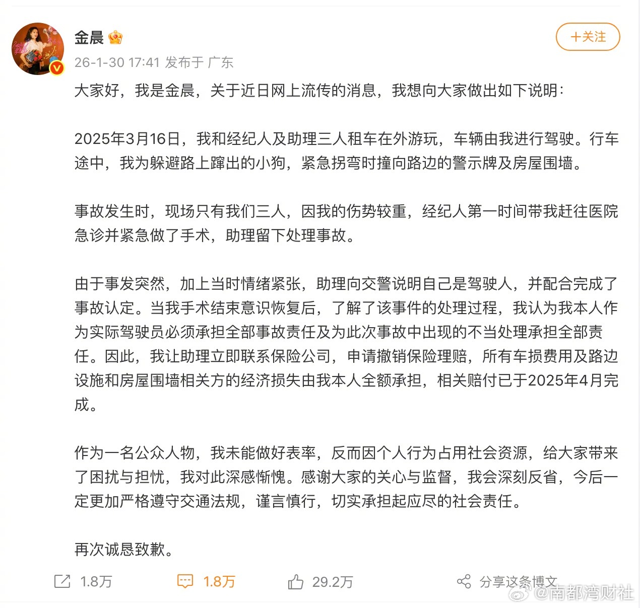 #金晨认为自己必须担全责#【#警方通报金晨涉嫌交通肇事顶包事件#】1月30日,#警方通报金晨事件# 后,演员金晨发文并晒出脸部受伤照回应,称事故发生后因自己伤势较重,第一时间赶往医院做了紧急手术。留下处理事故的助理,由于事发突然、情绪紧张向交警说明自己是驾驶人。当手术结束、了解情况后,金晨称认为自己应该承担全部责任,于是申请撤销保险理赔,并全额赔付所有车损费用及路边设施和房屋围墙相关方的经济损失。她对未能做好表率、占用社会资源道歉。