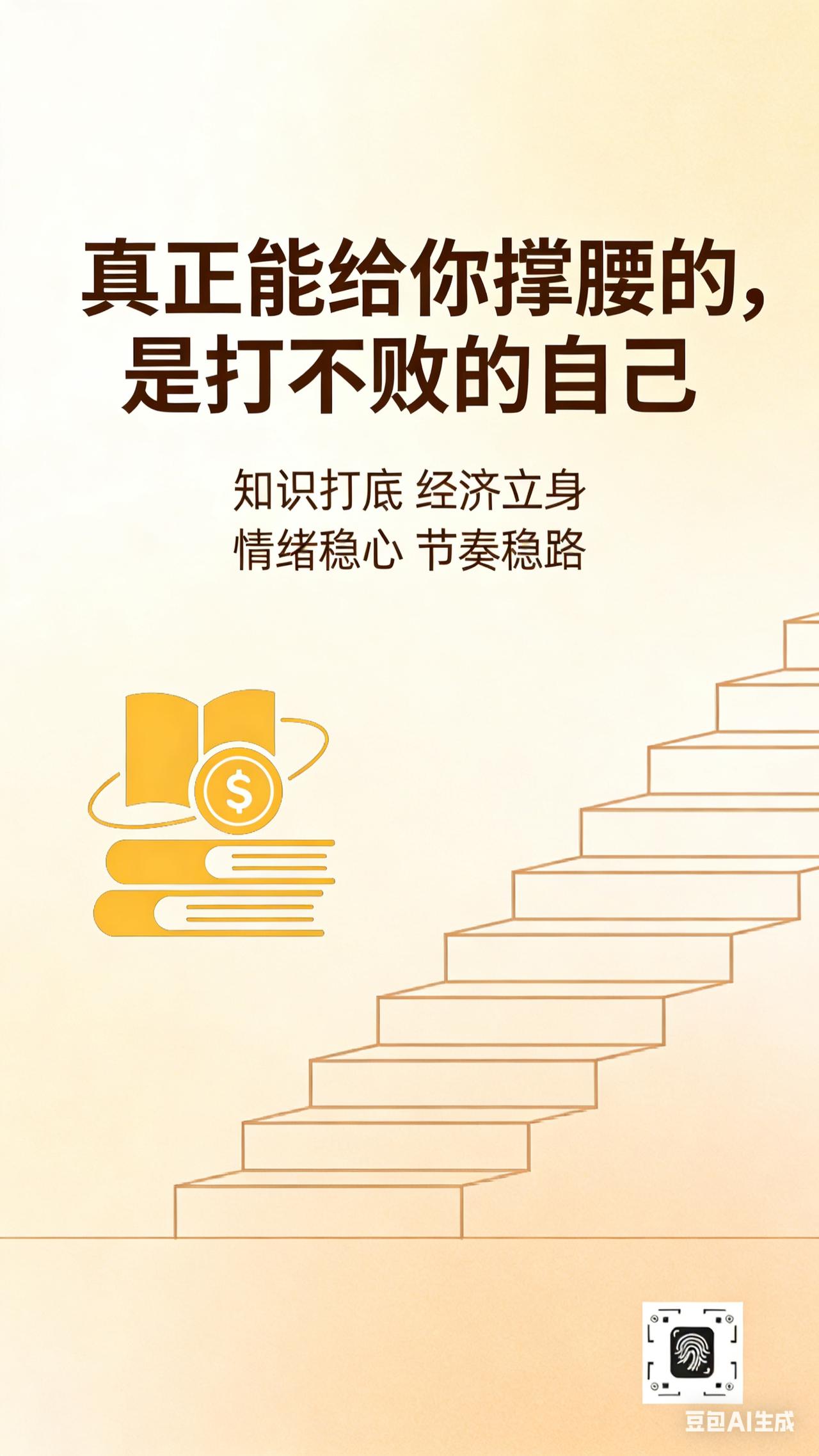 内核为光,自撑天地 人到半生才懂,真正能给你撑腰的,从不是别人,而是丰富的知识储备,足够的经济基础,持续的情绪稳定,可控的生活节奏,和那打不败的自己。 世间所有外在依靠,皆如流沙筑塔,风过即倾。唯有自身内核,才是立身根本。知识是底气根基,经济是自由前提,情绪稳则格局大,节奏可控方得从容,而打不败的自己,才是终极支撑。 靠山山倒,靠人人跑,唯有自渡方是归途。打磨内在,丰盈自己,你自己,就是最靠谱的靠山。 人生感悟 自我成长