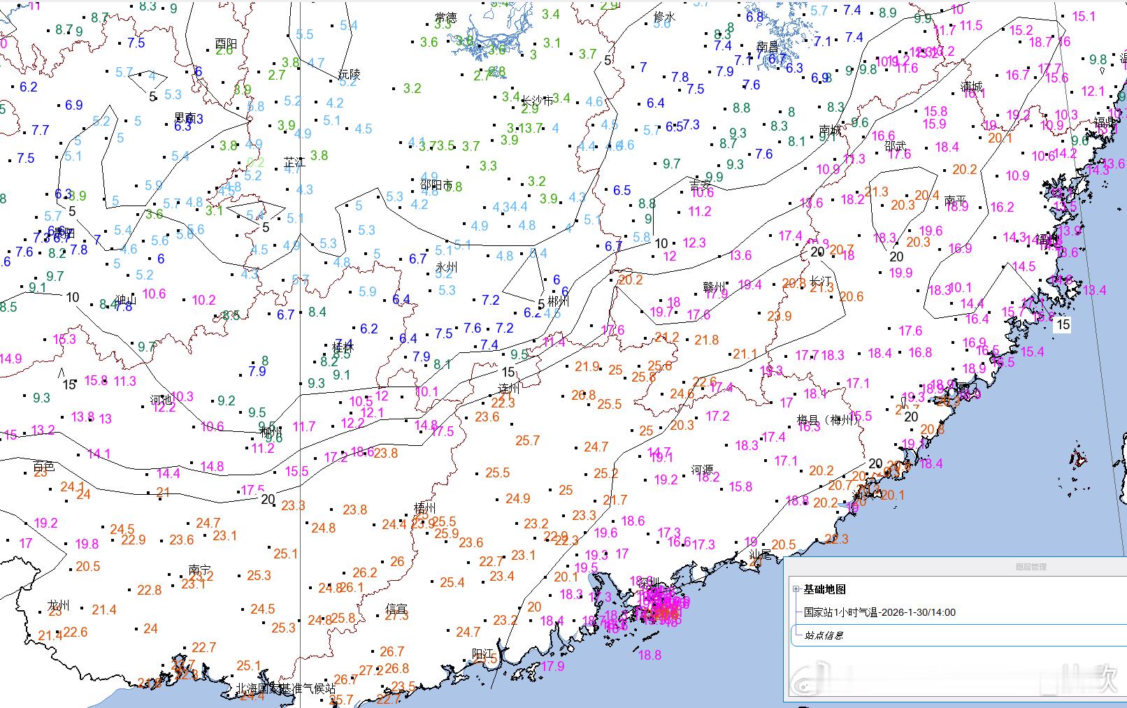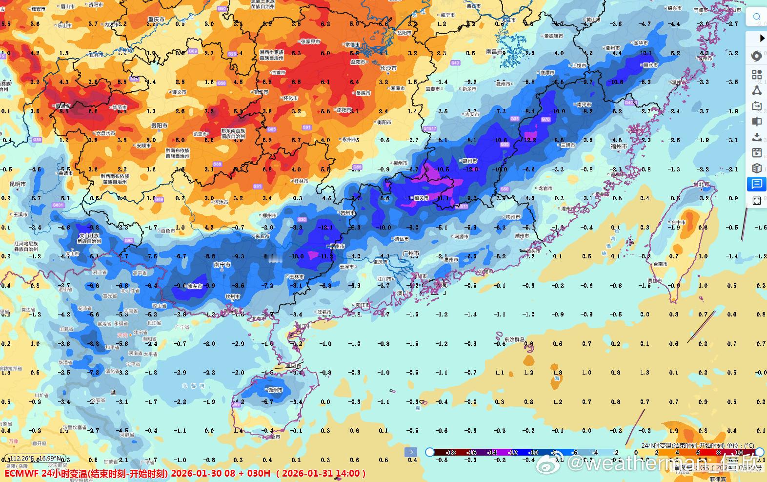 【气温补跌】今天下午,广西广东江西福建一带,在两片云区之间有个晴天的缝隙区。这里处于冷空气到来前的暖区中,还有光照加热,因此气温明显高于北侧冷空气控制的区域。14时广东乳源26.8℃,湖南郴州4.5℃,隔着南岭,差了20℃以上。明天冷空气继续南下,今天气温较高的区域,将是明天气温下降最明显区域。广西中南部、广东北部、江西南部、福建西部降幅有可能超10℃。