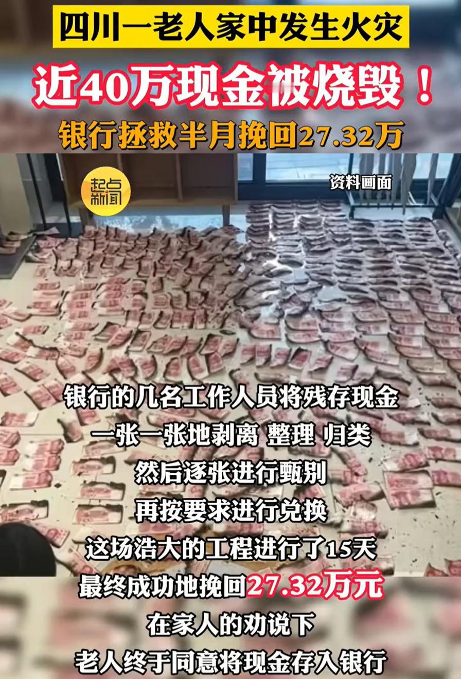 银行尽力了!四川自贡,一老人家里发生火灾,人倒是没事,但家里的损失就大了,老人在家里存的近40万现金被烧毁,银行整理了半个月,兑换回27万多,连银行工作人员都表示:在银行上班16年了,第一次见这么多被损毁的现金 赵女士介绍,爷爷奶奶平时生活有一个习惯,就是喜欢把钱放在家里,银行里一分钱都不存,可没想到这次一场大火,近40万元积蓄几乎烧成了焦黑的残片 赵女士把这些烧毁的现金抱到银行时,其实心里也没底。钱成这样了,还能不能认,还能不能换,谁都说不准。银行工作人员当场被震住,说16年没见过这种量级的火烧币,这句话一点不夸张。真正难的不是金额,而是状态,粘在一起、被水泡过、边缘碳化,很多已经没了完整轮廓 网点感觉靠自己处理不了,马上启动了特殊业务应急流程,一边登记备案,一边联系上级现金中心寻求专业支援。之后五六名银行工作人员一起上手,开始了这场细致又漫长的“抢救” 他们得先把粘在一起的钞票一张张小心剥离,尽量不造成二次损坏,然后按损毁程度分类整理,再逐张甄别真伪、核对金额。整个过程就像在做精细的手工修复,需要极大的耐心和专业判断 这场“抢救”持续了整整15天。最后清点下来,成功兑换出了27.32万元。虽然还是损失了一部分,但能挽回这么多,已经出乎很多人意料。赵女士一家很感激,老人也终于被说服,愿意把钱存进银行了 其实这个事故,让人意识到一个常被忽略的现实:现金放在家里,看似安全,其实风险全在自己身上。火灾、进水、虫蛀、偷盗,任何一个都可能让多年积蓄瞬间失控。很多人总觉得概率很低,可真轮到自己,连补救的空间都很有限 而且按照规定,残损币兑换标准很严格,能换回27万多,说明银行在合规前提下尽量做到了人性化处理。这也提醒我们,万一真遇到类似情况,别自己乱动残币,尽量保持原样,尽快找银行专业人员鉴定处理 老人把钱存进了银行,也算因祸得福。对于我们每个人来说,除了感慨,或许也该顺便检查一下自家的资金存放习惯,是不是安全合理