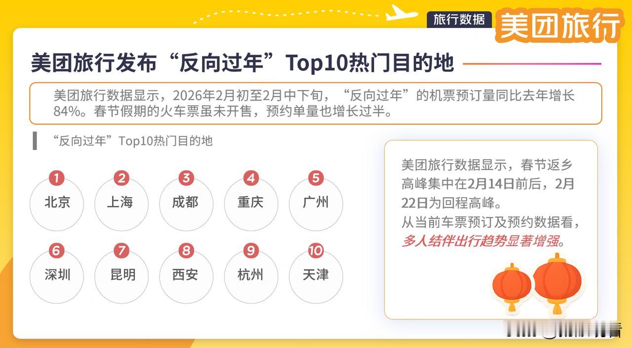 往年春节抢票堪比渡劫!今年果断跟风“反向过年”,接爸妈来我工作的城市,体验直接封神~ 我刷到美团旅行的数据真的惊到!2月初到2月中下旬,反向过年的机票预订量同比暴涨84%,热门目的地全是北京、上海、成都、广州这些好逛又好吃的城市,果然大家都懂怎么轻松过年~ 最香的是票源超充足,票价还比返乡方向便宜不少,再也不用蹲点抢票、挤人山人海的春运了!而且美团旅行还为55+长辈准备了全流程免费引导服务,带爸妈出行完全不用操心,不用担心他们不会线上值机、找不到登机口,真的太贴心啦~ 今年和爸妈在广州逛花街、吃早茶,不用赶时间拜年,每天慢悠悠打卡美食美景,这种轻松又温馨的团圆感,真的比传统过年舒服太多!已经决定明年还要这么过,反向过年党速速集合~ 反向过年新潮流 春节出行攻略