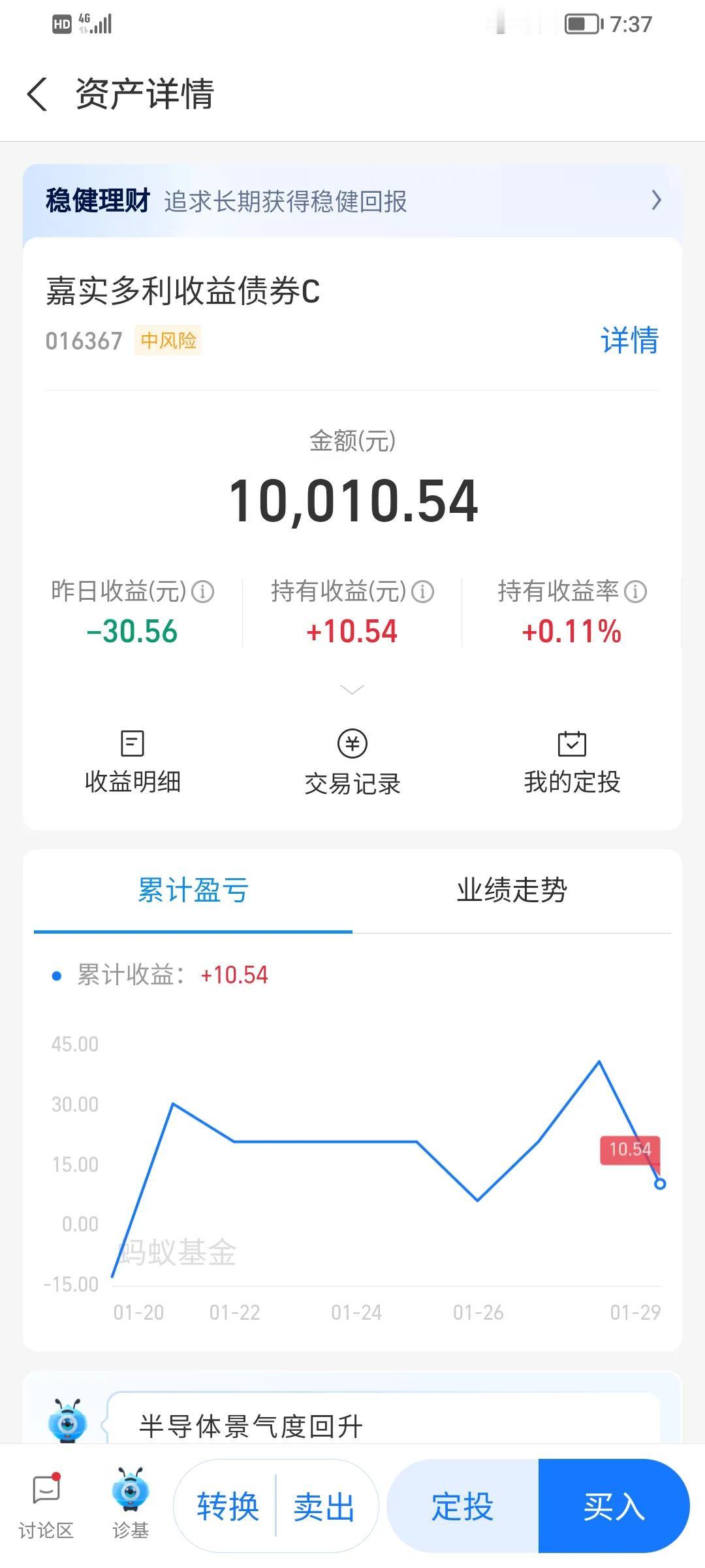 买了个寂寞。经支付宝推荐,我买嘉实多利收益债券 C,它是固收基金,1.19号买入一万元,1.20号开始确认份额,经历了十天,才赚了十元钱,距离我的理想差之甚远,当初如果冒险买黄金,现在早已过着锦衣玉食的生活了。