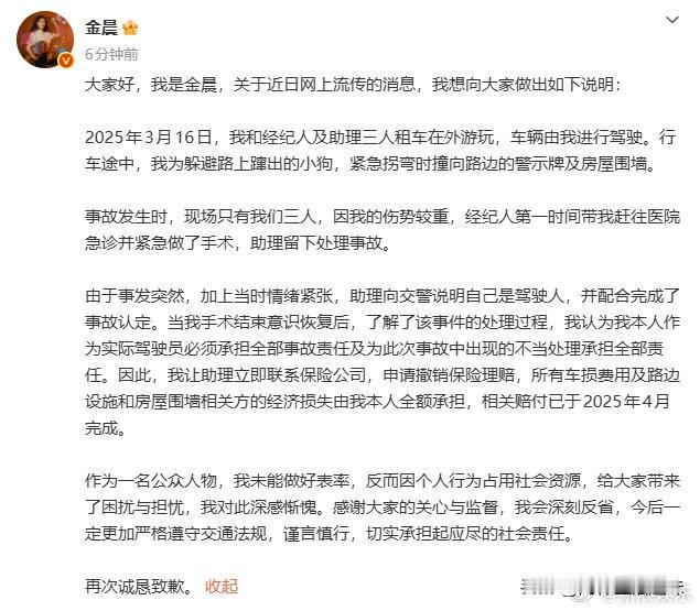 完了 这波“穷追猛打”金晨怕是招架不住了 交警已发布通告 已实证金某驾驶车出了交通肇事 金晨也在沉寂多天后发布道歉说明 有过交通事故 因伤势过重陪同人员一同去上海治疗 助理善意谎称是自己驾驶 但骗保不存在 据了解已有两家以上代言品牌 删除了和金晨的合作宣传 这事如果处理不好 她首先面临将是各类代言品牌的违约赔偿 可能会是天文数字 其次 相关的准备上映影视作品 也将面临换人重拍或删档 各类综艺晚会更是不要想了 我比较好奇的是 去年3月份出的事故 为何偏偏选择这时候被有心人曝光出来 仔细品一品…… 转移大家关注度最好的方式是什么?