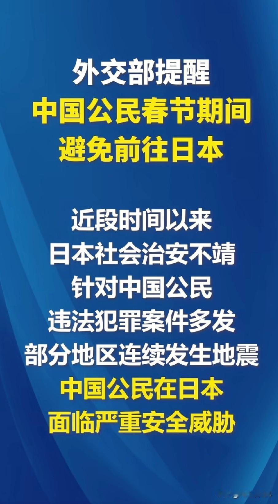 外交部再次提醒,无事不要去日本!请国人要有国家立场和尊严! 上一次提醒中国公民不要去日本是日本首相高市早苗说出了令人愤慨的台海有事,就是日本有事,插手台海问题,导致中日关系紧张,并且日本右翼分子及军国主义分子对中国人采取了暴力手段,所以当时外交部也发出了警告,但是有些人不知道怎么想的,偏偏在节骨眼的时候添乱,还到日本旅游。说句实话,假如没有袭击事件,为了国家和名族尊严,日本首相既然说出了那样的话,作为中国人不仅没有义愤填膺,还跑去给日本人送钱。作为中国人,说句不敬重的话,活的没有国家尊严! 1月29日,中国公民于日本再一次收到催泪瓦斯 袭击,这说明,如今日本人不欢迎中国人,请一些人不要再去做舔狗,上一次外交部已经发出警告,而一些人如同苍蝇一样扑向臭狗屎,飞到日本……… 为了避免事态升级,响应国家需要,一些飞往日本航班也取消了,作为普通百姓,要理解国家的深意,为了国际影响,不可能直截了当的杜绝国人去日本,只能含蓄的警告提醒,但是一些人就是不明事理,非要说是他个人的自由,于国家利益不顾。希望这次春节期间不要跑向日本,否则遇到事情不要怨天尤人,抱怨国家!!! 希望这次的提醒,能起到作用! 中方对日本态度 日本对华态度 日本涉台战略 日本旅游风险 暂缓赴日旅游 暂缓赴日旅游
