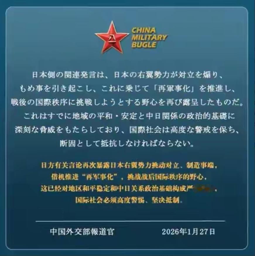 1月27日,外交部发言人转载了中国军号发布的日语海报:日方有关言论再次暴露日本右翼势力挑动对立、制造事端,借机推进‘再军事化’,挑战战后国际秩序的野心,这已经对地区和平稳定和中日关系政治基础构成严重威胁,国际社会必须高度警惕、坚决抵制。” 麻烦看官老爷们右上角点击一下“关注”,既方便您进行讨论和分享,又能给您带来不一样的参与感,感谢您的支持! 全球外交圈彻底炸开了锅,中国一改往日克制,罕见亮出强硬姿态,直接向全世界传递明确立场,字里行间全是不容挑衅的底气,这是中方被日本逼到忍无可忍后的警告与回击。 1月27日,中国外交部发言人在例行记者会上,公开就中国军号发布的日语海报作出回应,亮出中方立场与底线,没有多余铺垫和委婉措辞,让全世界看得明明白白。 那张日语海报直击要害、字字铿锵,点出日方近期不当言论,彻底暴露日本右翼势力挑动对立、制造事端的心思,他们以“增强防御”为幌子推进再军事化,试图打破战后秩序,野心昭然。 而中方这番表态绝非空穴来风,日方多年所作所为早已越界,一系列挑衅不仅威胁东亚和平稳定,还触碰中日关系政治基础,这样的行为,国际社会必须警惕、坚决抵制。 中方之所以如此强硬,全是被日本右翼势力一再挑衅所逼,要知道中国向来爱好和平、不主动惹事,但也绝对不怕事,国家的主权和底线,绝不容许任何国家随意侵犯。 这件事的导火索是日本政客高市早苗的荒唐言论,她公然宣称台海危机时美日可能联合撤离公民,还放话不抛弃盟友,明目张胆干涉中国内政,无视中国主权与底线。 众所周知,台湾自古就是中国不可分割的一部分,台海问题是中国内政,任何国家都没资格指手画脚,更何况日本曾殖民台湾半个世纪,更无资格对台海事务说三道四。 然而,日本右翼势力近年加速推进“再军事化”,扩充军备、增加军费,还频频与美国勾结搞联合军演,蓄意制造地区紧张,早已突破战后国际秩序的底线。 这已经不是中国第一次警告日本,早在2025年11月,中国军号就曾转发外交部发布的日语海报告诫日方,可日方置若罔闻、我行我素,丝毫没有反思悔改,才让中方再次亮出强硬态度。 此次外交部就海报作出回应,既是向世界重申立场,也是第二次向日本发出严正警告,这已不是简单口头抗议,更像是“动真格”前的最后通牒,毫无回旋余地。 面对中方警告,日方不仅不收敛,反而嘴硬反驳,指责中方激化矛盾,辩称自身言论合法,这种自欺欺人的说法,根本站不住脚,让人不齿。 中方此次亮明立场,既是捍卫自身主权领土完整,也是维护东亚和平稳定,日本再军事化不停步,不仅威胁中国,也会给周边国家带来隐患,绝非小事。 很多人疑惑中国是否会真的动手,其实中方初衷从不是发动战争,但若日本继续执迷不悟、肆意挑衅,中方必定果断反制、绝不手软,捍卫国家权益。 这事给我们深刻启示,无论国家还是个人,一味退让妥协换不来尊重,只有自身强大、态度坚决,才能守住底线、捍卫属于自己的合法权益。 中国的强硬表态,从不是好战信号,而是和平的守护,我们渴望和平,但绝不畏惧战争,任何挑衅底线、侵犯主权的行为,终将付出沉重代价。 日本右翼势力若继续执迷不悟、挑衅中国,终将自食恶果,破坏中日关系、把日本推向深渊,要知道和平来之不易,挑衅和平者必被和平抛弃。 信源:1. 央视新闻(2026年1月27日《外交部:敦促日本停止在台湾问题上的操弄和妄动》);2. 央广网(2026年1月29日《社评:套上马甲也无法改变高市涉台言论的非法性》);3. 人民网(2026年1月28日《日方没有任何资格对中国台湾置喙》);4. 新华网(2026年1月29日《国防部:坚决遏阻日本军国主义幽灵再现》)