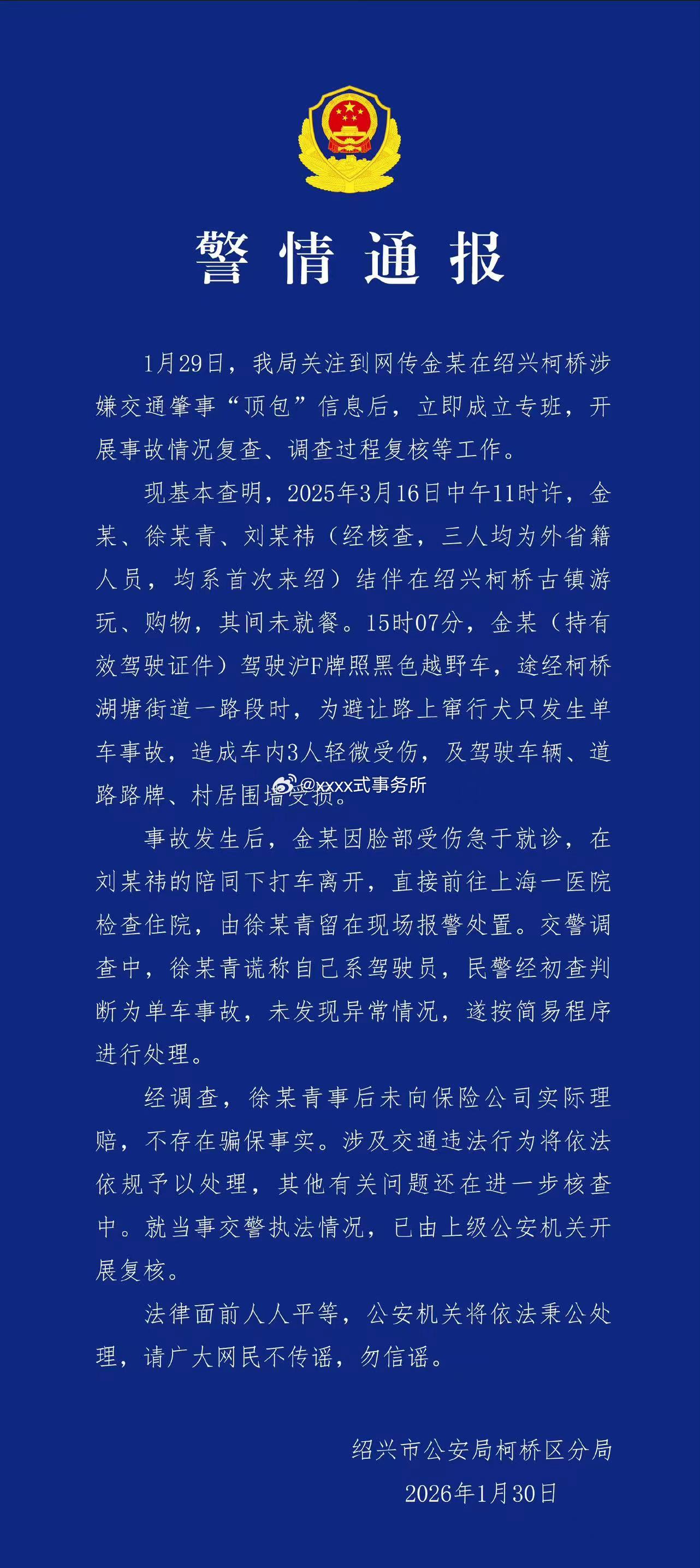 说真的,抛开金晨的明星光环,这不就是个标准的单方事故吗?全责,保险修车(她自己赔了),赔偿路产。感觉很多人的怒气,更多是冲着明星去的,而不是事故本身警方通报金晨事件金晨道歉