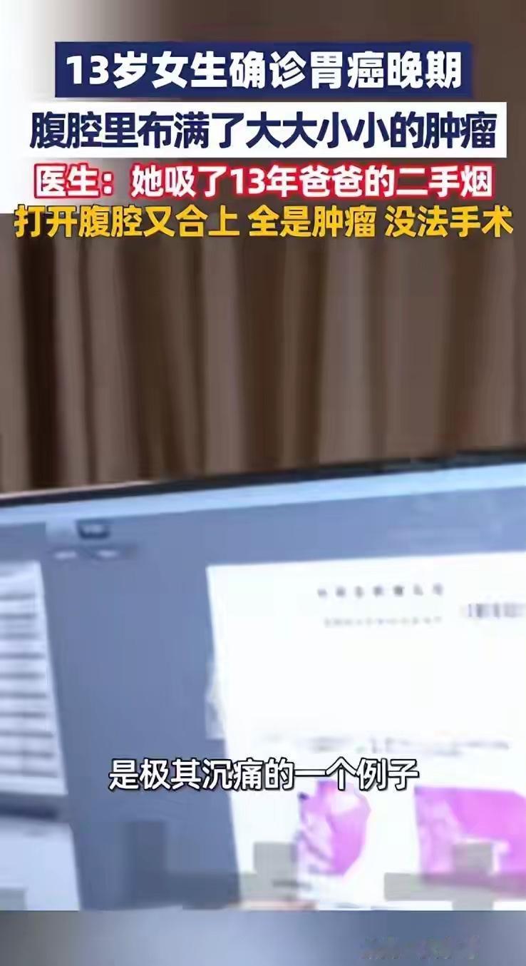 最近,河南省肿瘤医院消化科就接诊了一名年仅13岁的胃癌晚期女孩,因为女孩爸爸常年吸烟,在家也从来没有避开过孩子,使得孩子从小生活在充满二手烟的环境里,让医生都心痛到愤怒:“给孩子做手术,腹腔打开又关上了,根本没法手术,全身多发转移,腹腔像撒豆子一样布满了大大小小的肿瘤,这种是没有任何治愈机会的。”再次提醒大家,一手烟二手烟的危害是一样的,只要吸入对全身都有害。 有网友表示:其实是找不到致癌的原因,就说是吸了二手烟。以前的人大部分都抽烟,但得癌症的比现在少。我认为是现在的各类物品中所含的化学成分致癌。 二手烟虽然有危害这是不争的事实,但不可能孩子恶性疾病罪魁祸首就是二手烟,我说的意思是,因为现在很多孩子天天离不开各种零食,什么薯条什么什么琳琅繁杂的袋装小食品,它们哪一个不是用防腐剂,甜味素,色素,各种添加剂,黄油做成的?这才是罪魁祸首! 抽烟最厉害的估计是麻将馆了,特别在冬天,开了空调,抽烟的有七八个人,那个里边呀,烟雾缭绕,如果有一二个人不抽烟,这个二手烟可厉害了,不知打麻将的人是怎么生存下去的。 我觉得与二手烟没关系,有不少肺癌病人既不抽烟家人也没有烟民,癌症与精神压力负能量有关,这些导致免疫力被癌细胞钻空子。 对此大家怎么看呢