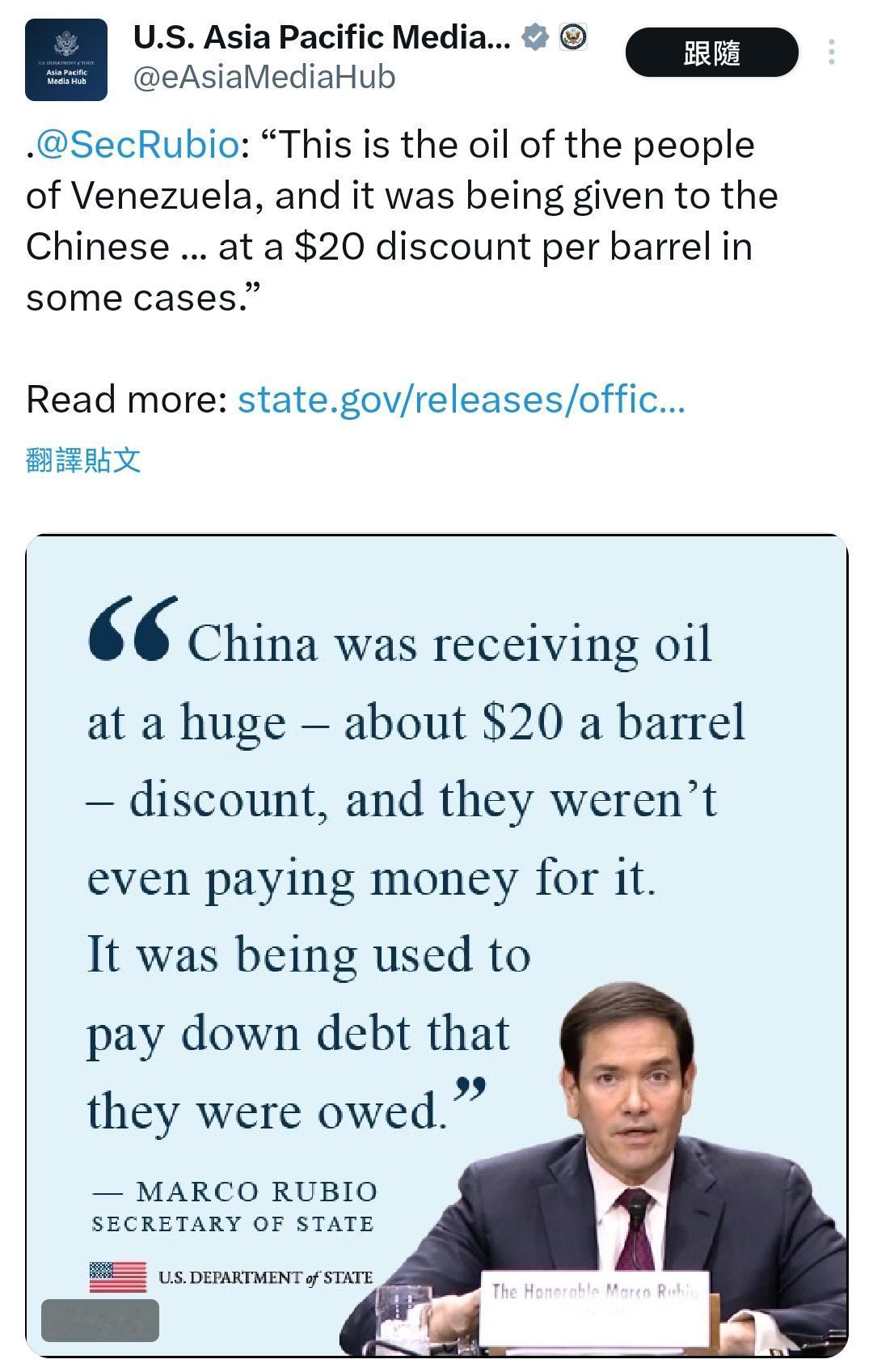 美国大使馆这是别有用心的造谣啊! 什么叫“这是委内瑞拉人民的石油,却在某些情况下以每桶20美元的折扣价.…拱手让予中国。” 鲁比奥的说法虽然也是真假掺半,用心险恶,但至少价格这一句他说的是真话,怎么到美国大使馆就成了“每桶20美元的折扣价”了呢? Grok AI的事实查核结果是:中委的成交价格是“discounts up to $21/bbl below Brent”(相对布伦特原油的贴水高达每桶21美元。) 而鲁比奥下一句“and they weren't even paying money for it”中,一个“even”,生生把“剥削”、“不公平贸易”的帽子安在了老中头上。 需要说明的是,中国对委内瑞拉提供了数百亿美元的贷款,用于其国家建设。用石油偿还,是天经地义的债务结算方式,也是国际资本市场常见的安排。将“偿还债务”说成“甚至不付钱”,简直就是颠倒黑白。 后面再怎么解释——“哦,那是为了还债“,都成了苍白的找补…… 明明是G1,行事咋就不能体面点? Source: X