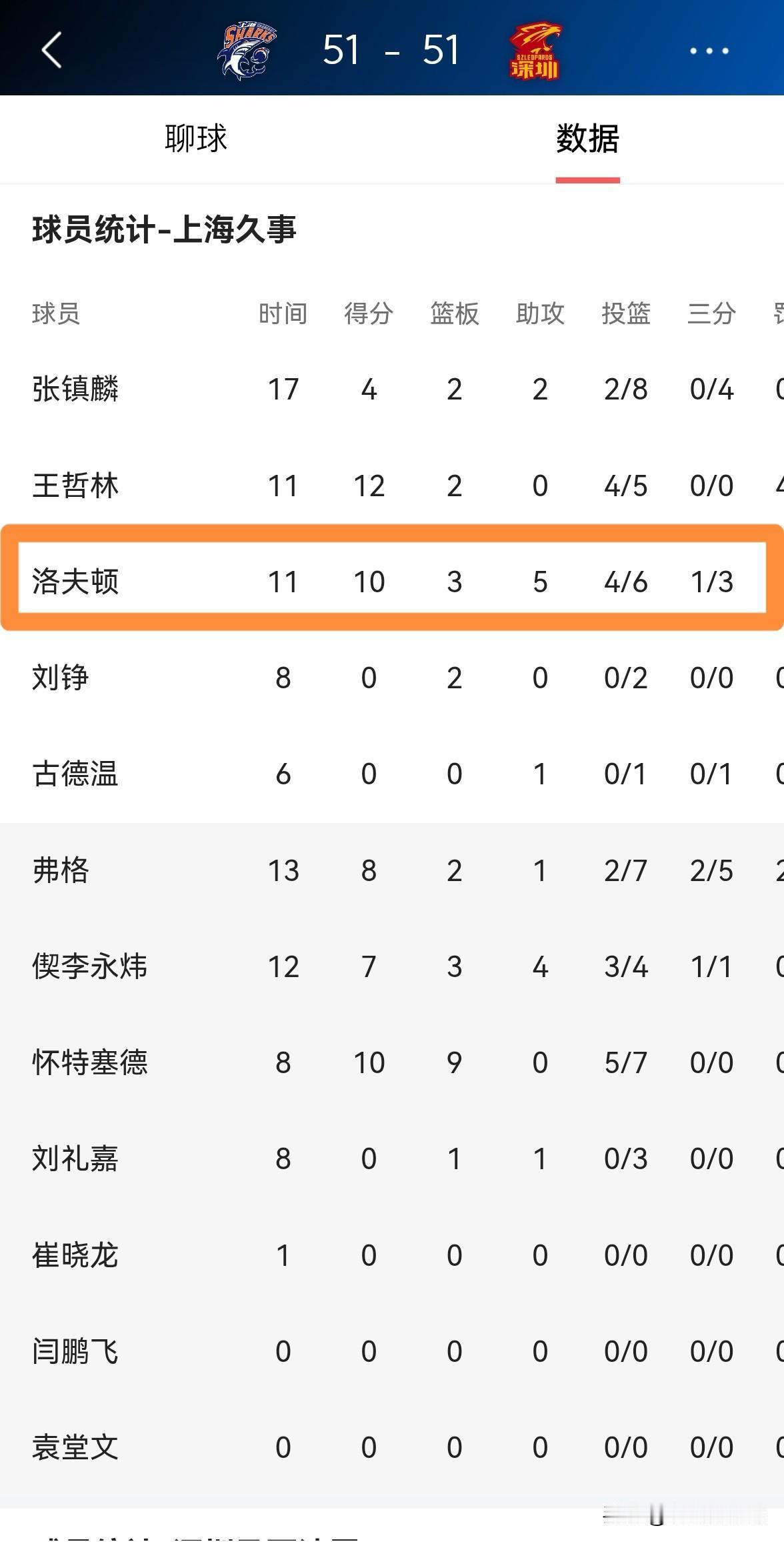 上海久事超级外援洛夫顿真是多才多艺!在今天上海久事主场迎战深圳马可波罗的比赛中,目前两队的上半场比赛已经结束,双方战成了51平。在前两节比赛中,洛夫顿将自己的全面性展现的淋漓尽致,他在首发出战的11分钟里,投篮6中4,其中三分球3中1、罚球2中1得到10分,还有3篮板5助攻1抢断1盖帽。 坦白说,洛夫顿不仅能攻善守,而且还能组织串联,他简直就是CBA赛场上的约基奇。