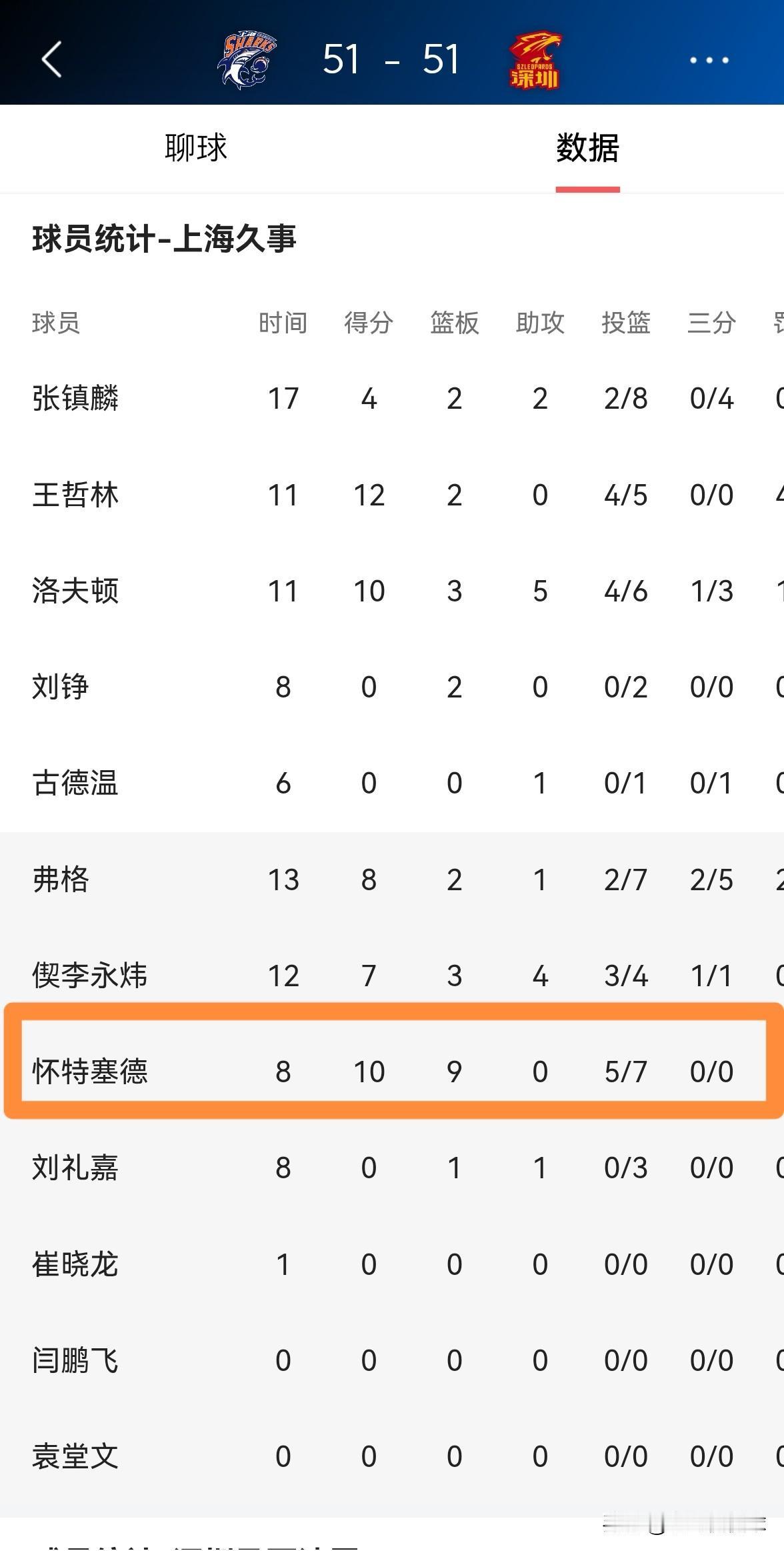 上海久事外援怀特塞德真是得吃得喝!在今天上海久事主场迎战深圳马可波罗的比赛中,现在双方的上半场比赛已经结束,两支球队战成了51平。在前两节比赛中,怀特塞德在篮下真是得吃得喝、予取予求。 在上半场比赛中,怀特塞德替补出战8分钟,投篮7中5非常高效的砍下10分9篮板1抢断,他的场上正负值为+7。 老实说,当上海久事在第一节比赛中处于落后的时候,正是怀特塞德的上场改变了球队的走势,他在攻防两端都打出了无可争议的表现。