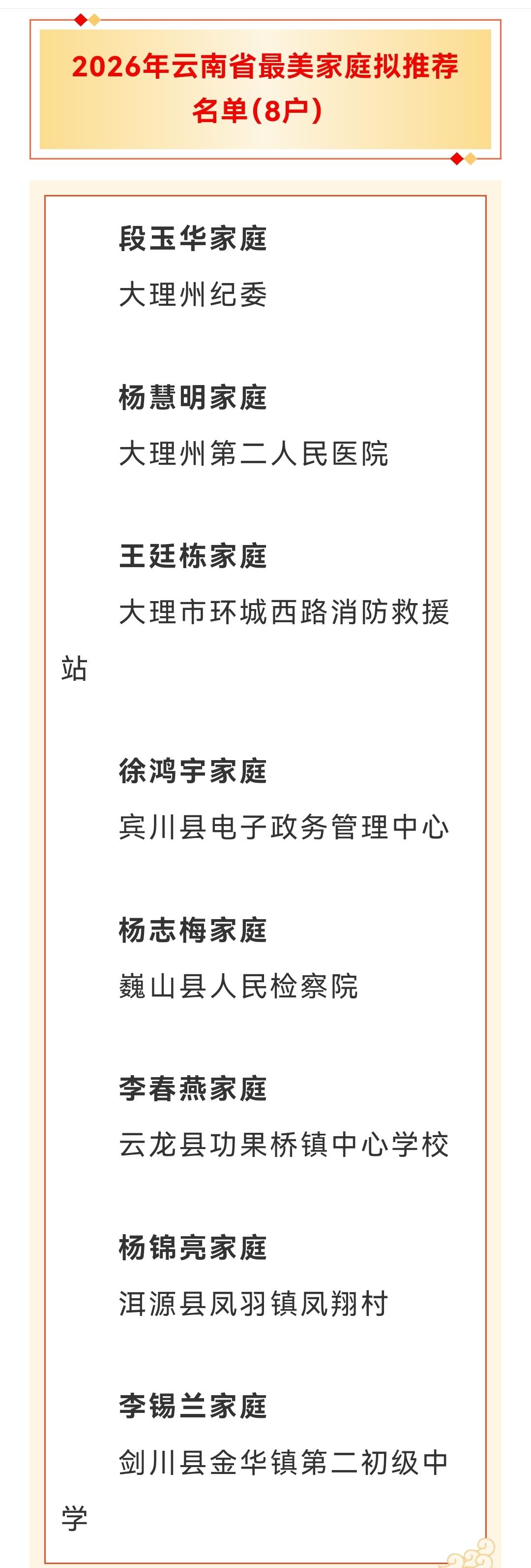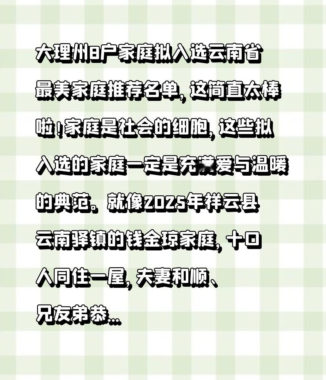 大理州8户家庭拟入选云南省最美家庭推荐名单,这简直太棒啦!家庭是社会的细胞,这些拟入选的家庭一定是充满爱与温暖的典范。 就像2025年祥云县云南驿镇的钱金琼家庭,十口人同住一屋,夫妻和顺、兄友弟恭。夫妻二人在工地打拼还拉上弟弟,公婆在家照料晚辈、操持家务。他们用和睦与勤劳书写着最美篇章。 这次大理州的8户家庭也值得期待,希望他们能顺利入选,成为更多家庭学习的榜样,让这份美好在社会中传递开来!公示时间是2026年1月29日至2月4日,一起关注吧。
