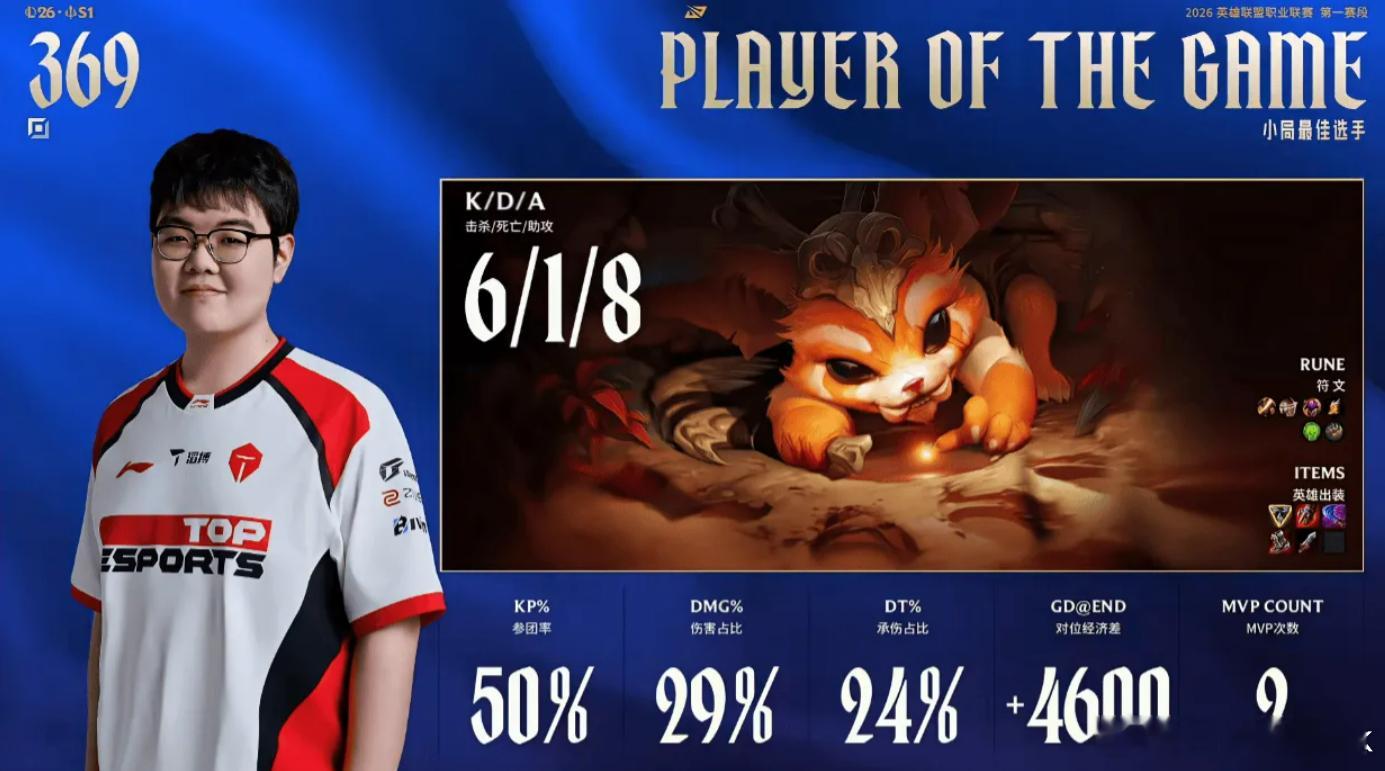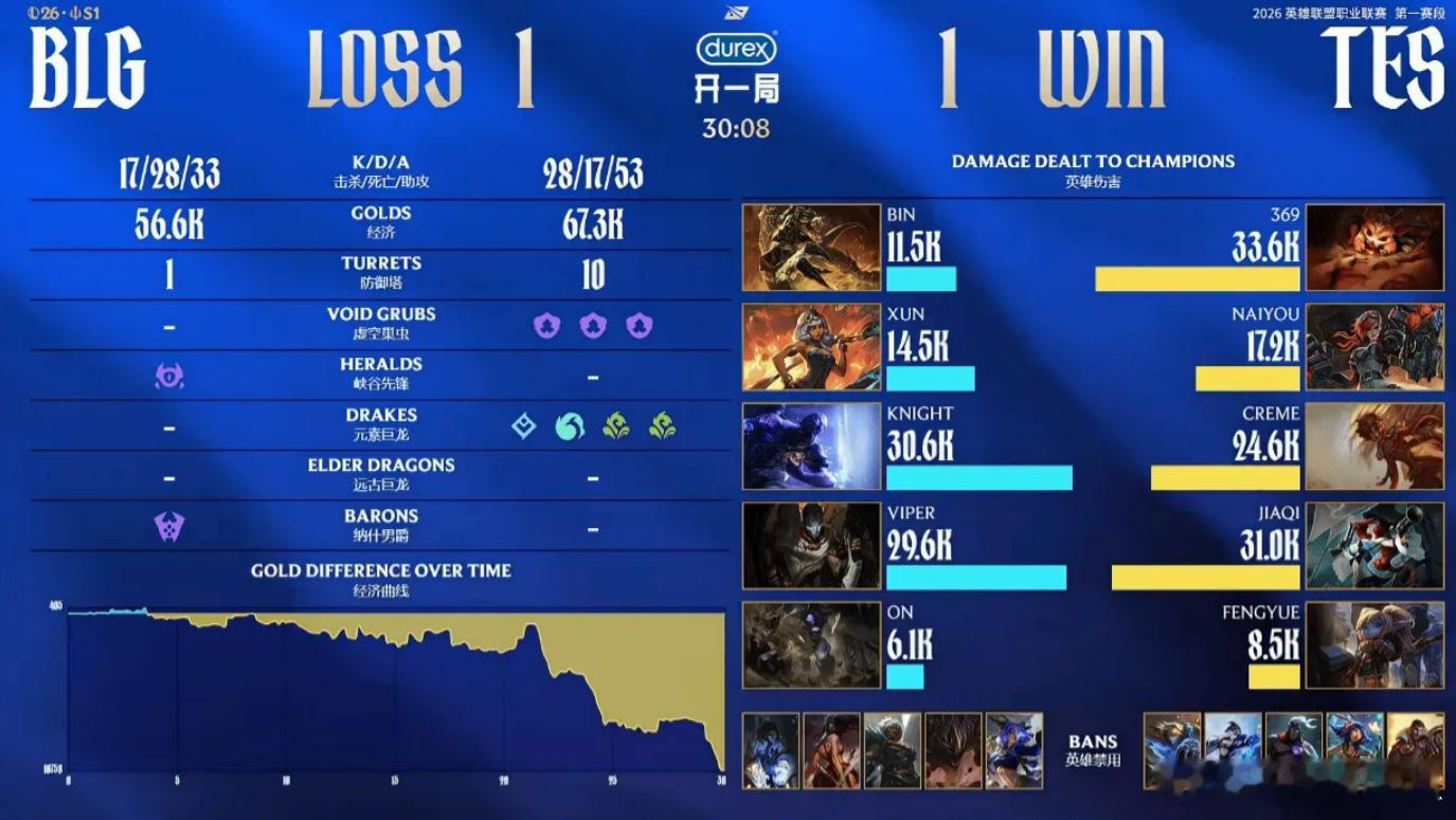 上单Gap!这把369纳尔线上单杀Bin鳄鱼,大龙团也直接游龙,完美大招拯救队伍,Xun琪亚娜没啥节奏,第一波抓下能被fengyue控到就离谱,给了Naiyou速龙的机会。Viper和Knight回天乏术,TES将BLG拖进决胜局!看到一条弹幕很搞,吾有上将杨文波(不是喻文波),可否斩69?