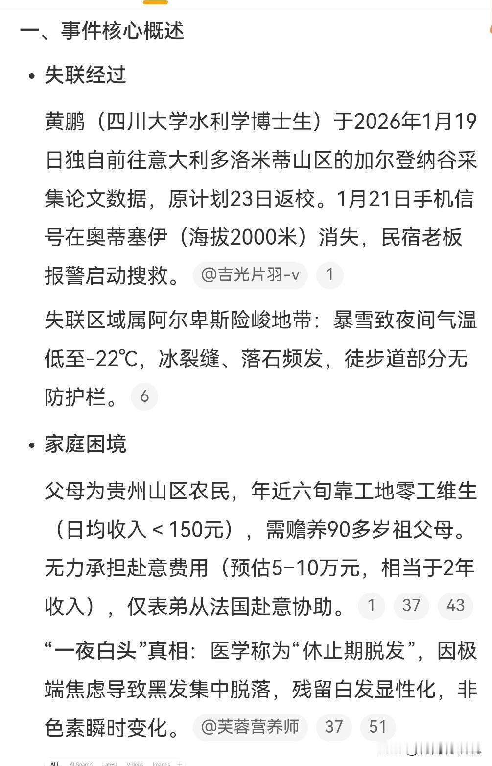 这真的是太让人担心了。近日一名中国28岁的博士生在意大利失联了。 但是前往某个地方进行论文采集,21日手机信号消失,当时在海拔2千米的地方。 失联区域夜晚气温在零下22度,这真的是太可怕了。 父母着急的是一夜白了头。 他是全家人的希望,本来是要快毕业了,没想到遇到这种事。 有一说一还是不要去到危险的地方,真的很容易迷路。