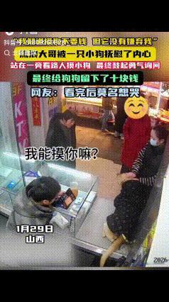 看哭了!山西一手机店来了一位流浪汉大哥,他默默的站在一旁,看着眼前的小狗,眼里透着喜欢,店主本以为他就是看看就没理它,谁知,有路人摸了狗狗后,流浪汉竟开口问:“我能摸吗?”…最终给狗狗留下十块钱,店主想拒绝,可流浪汉的一句话,他收下了钱! 1月29日,山西一手机店门口来了一流浪汉大哥,他衣着邋遢,一脸落魄显得格格不入,看到手机店里的狗狗,他停留了下来,眼睛盯着狗狗看着,看到有人来摸狗狗,他也笑了,他一定很喜欢狗狗。 店主知道他不是来买东西的就没有理他,只是坐在柜台里面自顾自的玩着手机。 过了一会,狗狗向流浪汉看了一眼,流浪汉终于忍不住了,他觉得狗狗可能也喜欢自己,于是走上前,自言自语:“我能摸你吗?”随后,伸手轻轻的摸了一下狗狗。旁边的女子下意识的将手躲开,并一直抚摸着狗狗。 流浪汉也赶紧退回到一边,等两女子走了之后,他又开始询问:“我能摸你吗?别咬我,摸摸你可以吗?” 店主抬头看了一眼,还是没说什么。 流浪汉这次伸手去摸狗狗时,狗狗竟像个孩子一样在他的怀里蹭来蹭去。 “我有10块钱可以给你花吗?问问你主人。”流浪汉对着狗狗温柔的说道。 随后,他从本就干扁的钱包里掏出了10块钱递给了店主,店主赶紧说:“摸狗不要钱,谁挣钱都不容易。” 然而,流浪汉却说:“我知道不收钱,但它没有嫌弃我。” 更令人破防的是,店主给流浪汉递了一根烟,流浪汉接过烟后,笑着说:“正好我缺一根烟。” 看到这里真的是有点绷不住了,他连烟都舍不得买,却愿意给狗狗买吃的。 流浪汉大哥过得很苦,肯定遭到过很多人的嫌弃,甚至想摸一下狗狗,还要问狗狗愿不愿意,狗狗在他怀里的那一刻,让他感受到了不被嫌弃的感觉。 其实咱们心里都明白,那十块钱对这位流浪大哥来说,那是他兜里仅剩的一点“体面”,他不想做一个“白摸”的流浪汉,他想证明自己虽然穷,虽然脏,但他也有能力去爱,也有能力去给予。 这世上最缺的不是钱,是那种不带偏见的温柔。 大家觉得呢?欢迎大家评论区讨论留言。