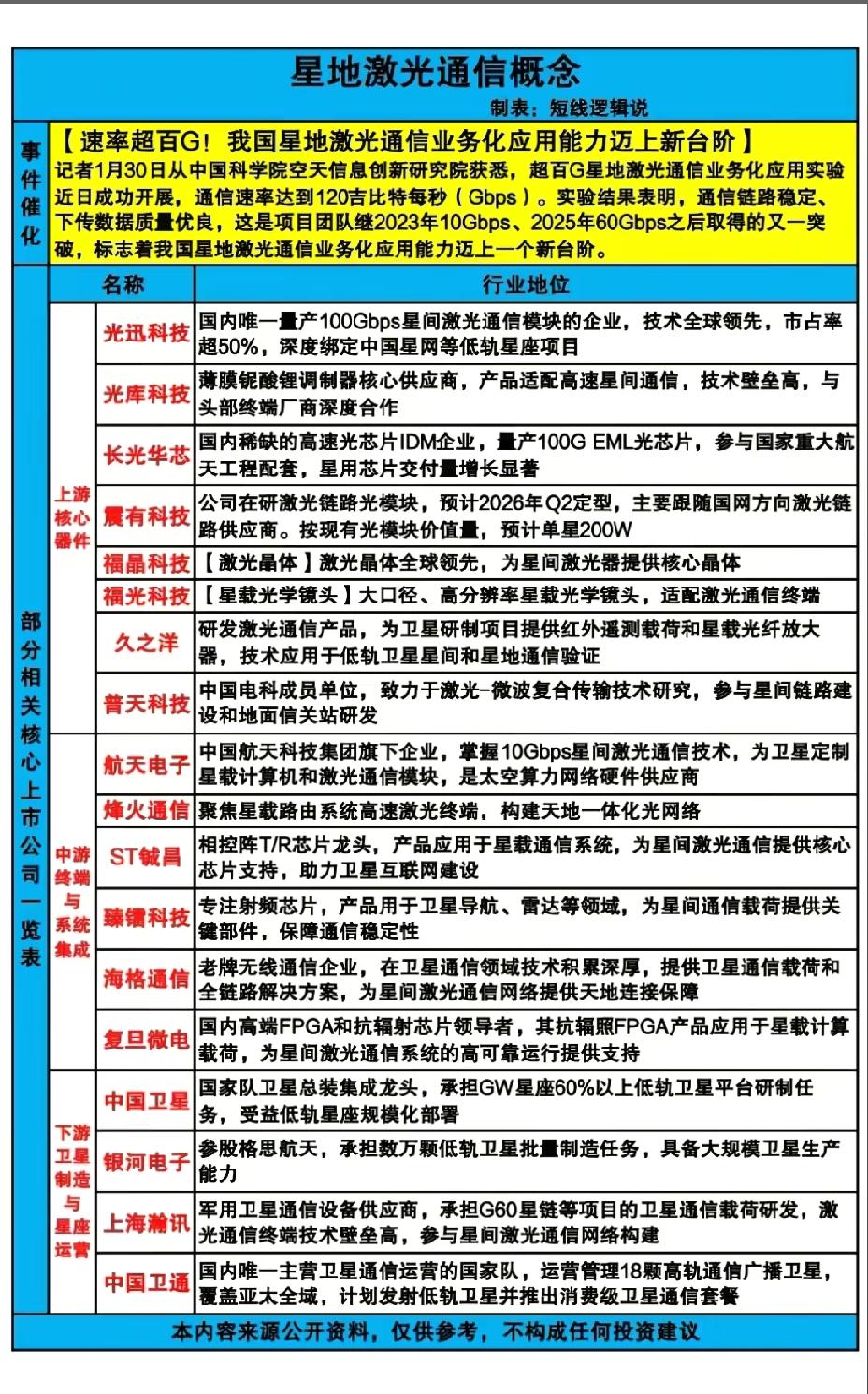 1月30日,周五A股这个板块值得重点关注!!! 速率超百G,我国星地激光通信业务化应用能力迈上新台阶,通信速率达到120吉比特每秒,实验结果表明,通信链路确定、下传数据质量优良,相关概念股值得重点关注!!!