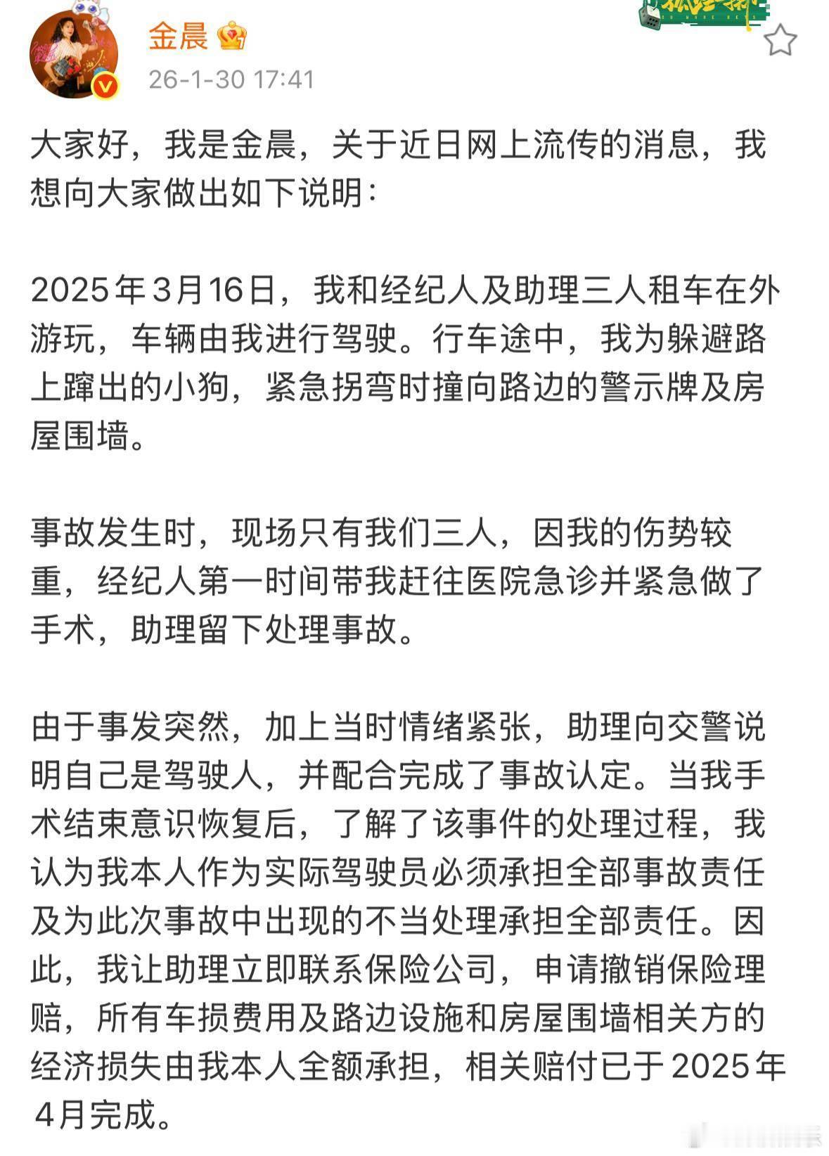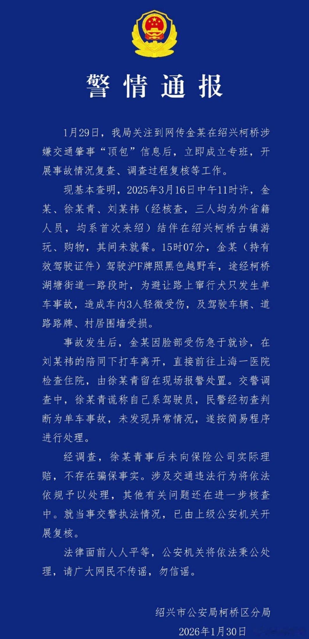 警方通报金晨事件警方核查金晨2025年3月绍兴事故,确认其为实际驾驶人,助理谎称驾驶人事后未理赔,当事交警执法情况正复核。