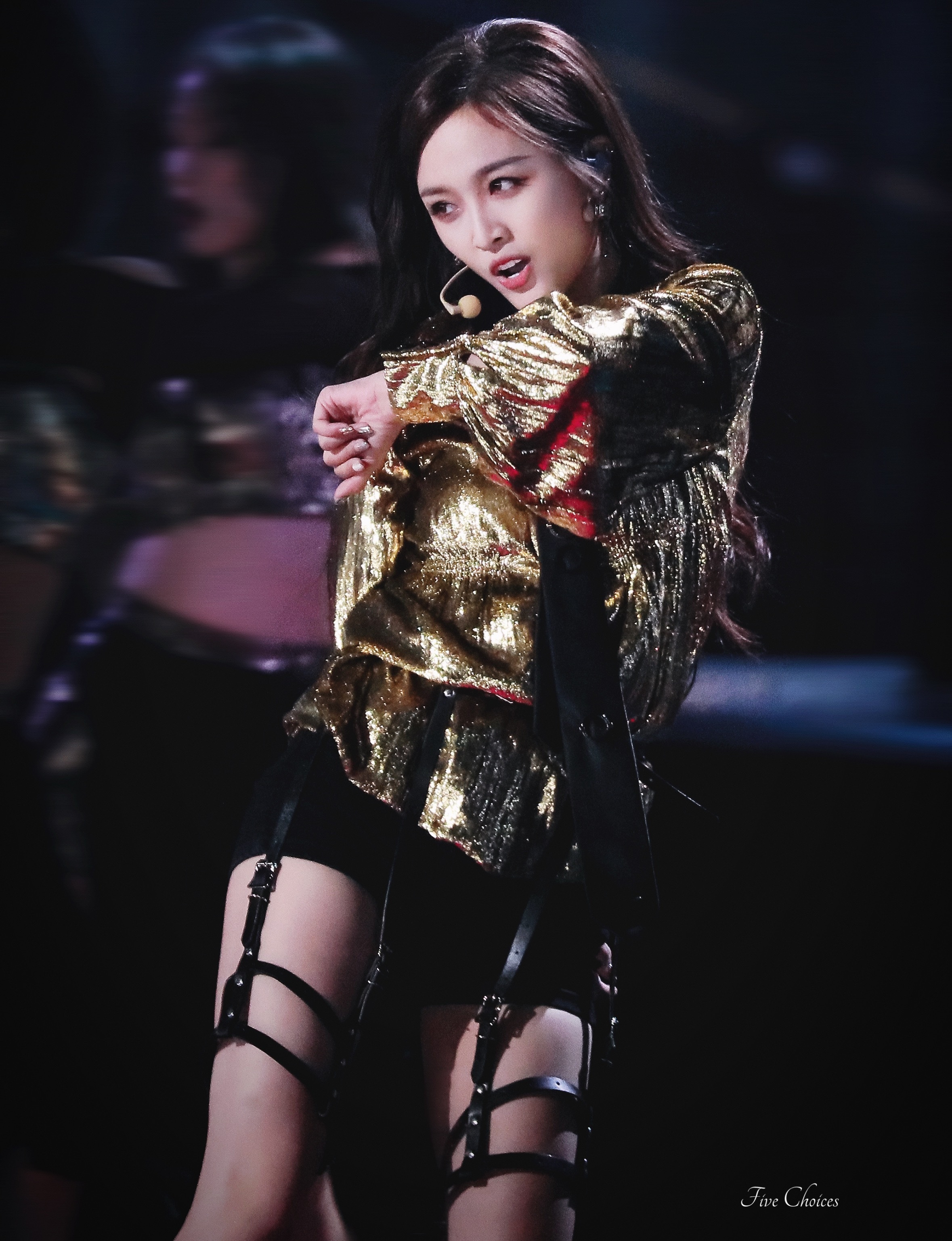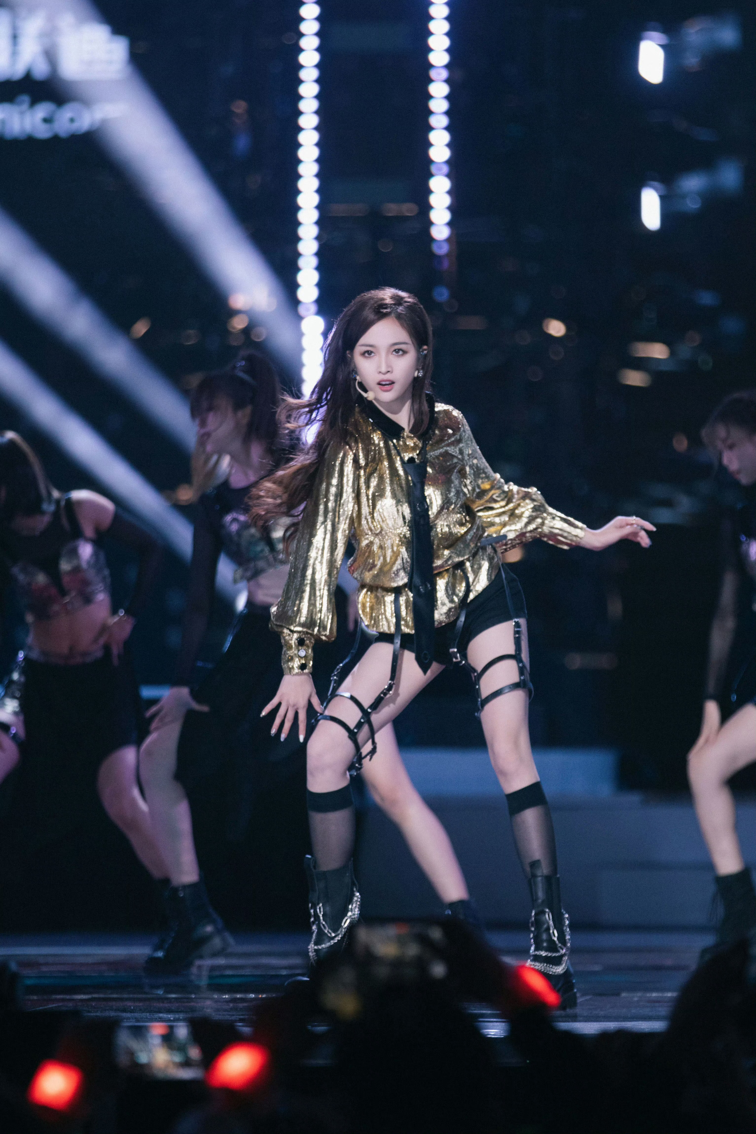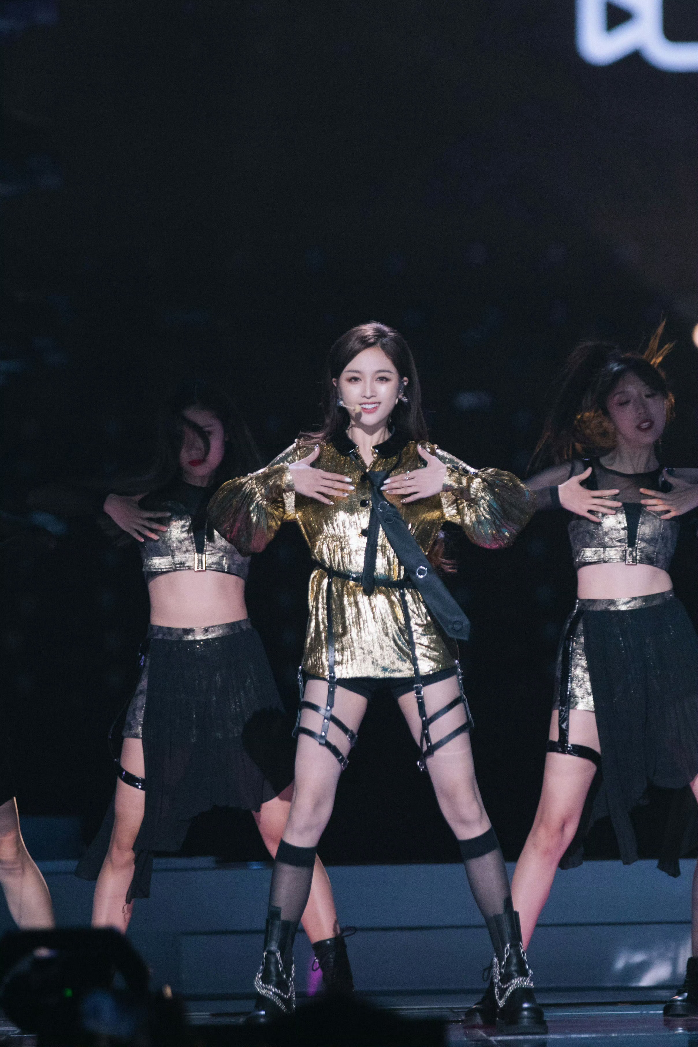 吴宣仪黑金绑带裙子。太带感了