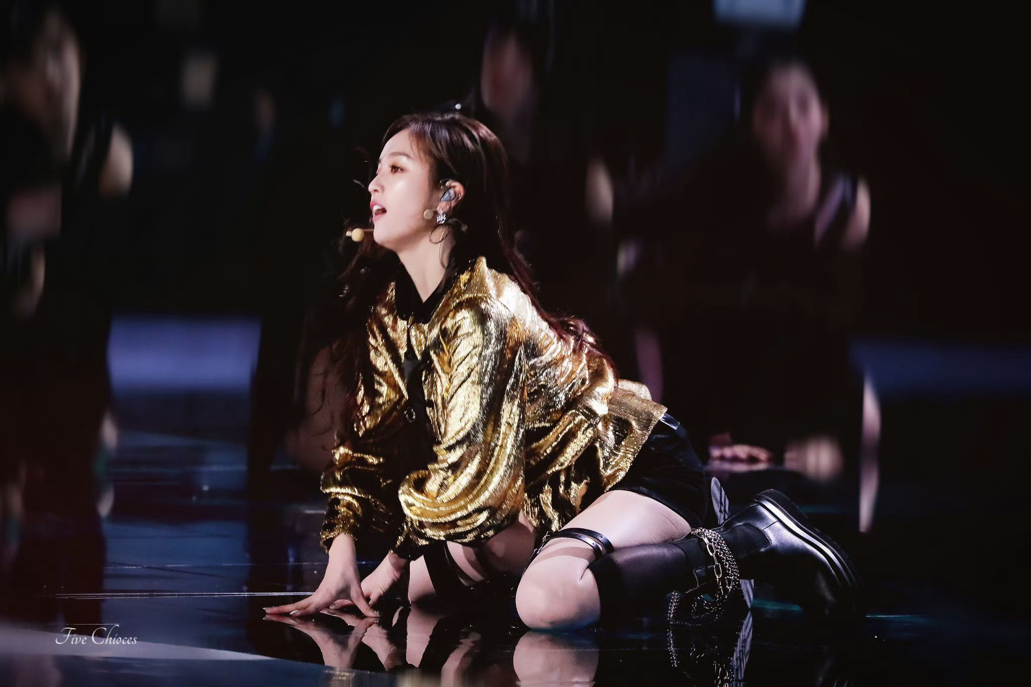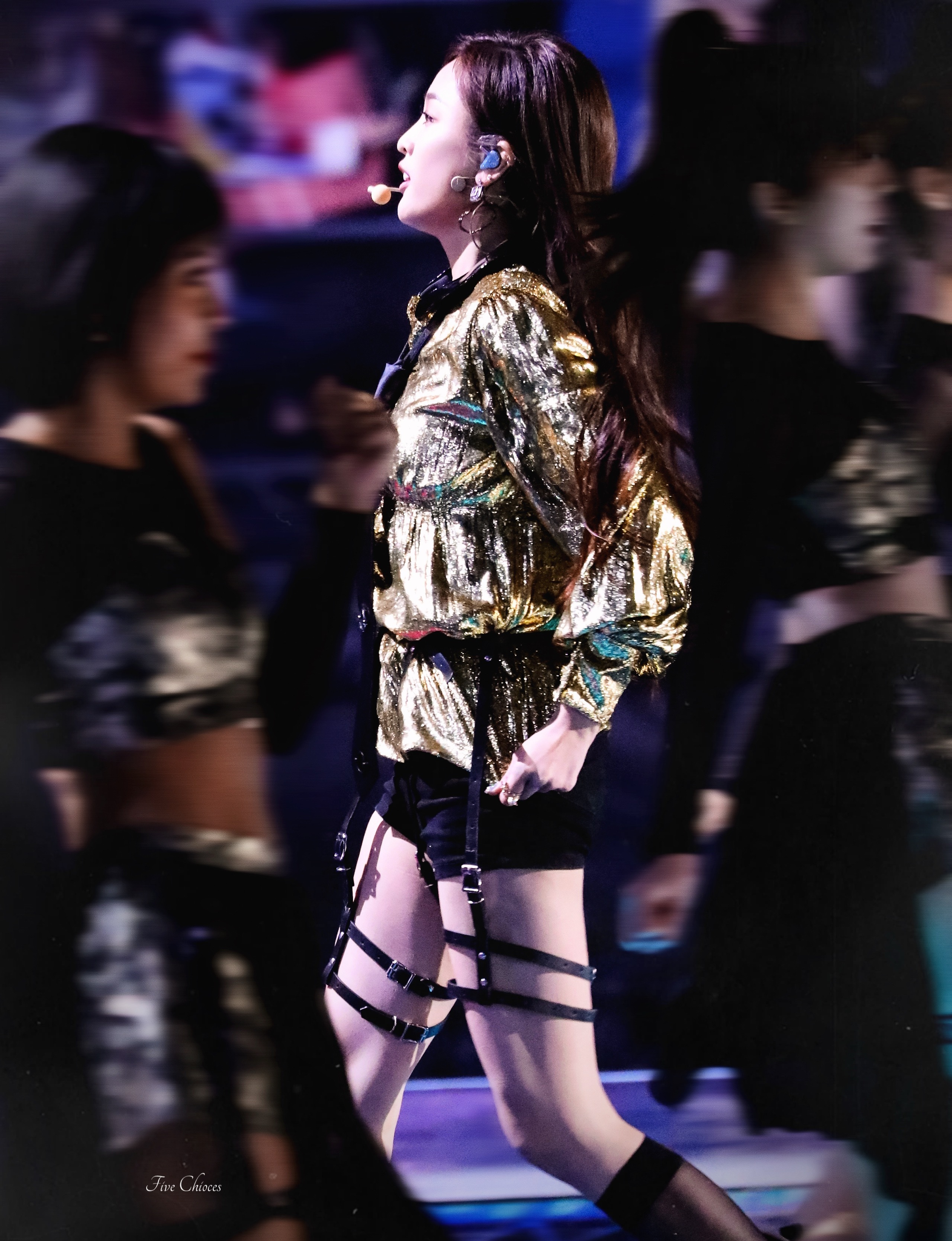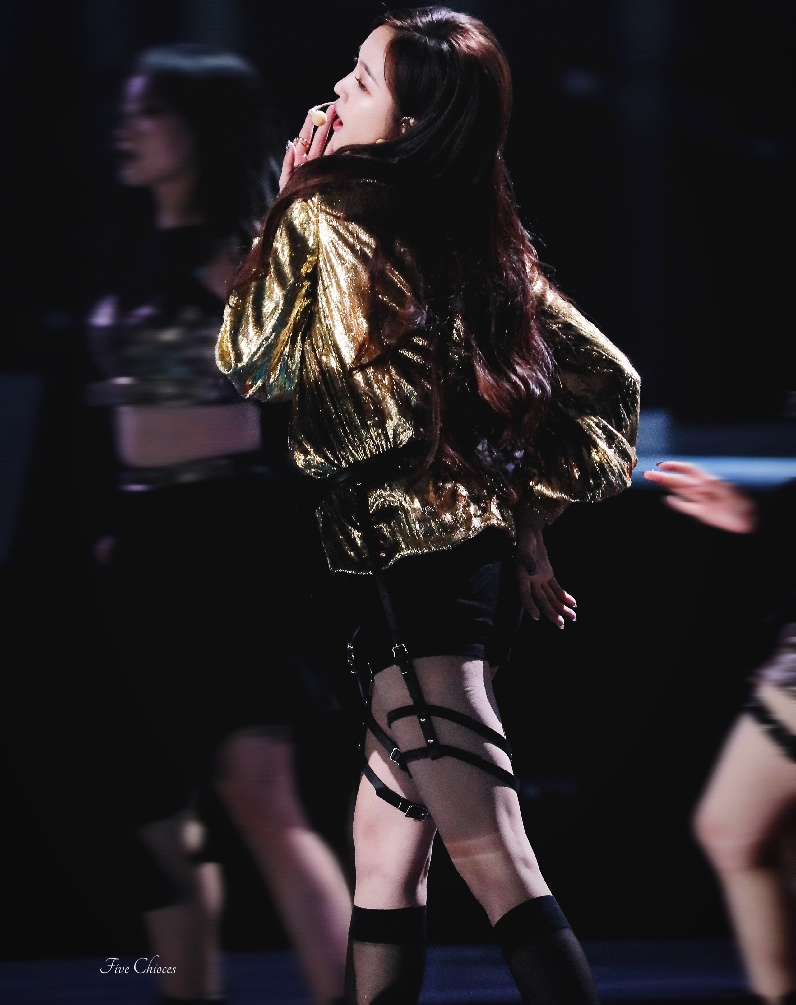 吴宣仪黑金绑带裙子。太带感了