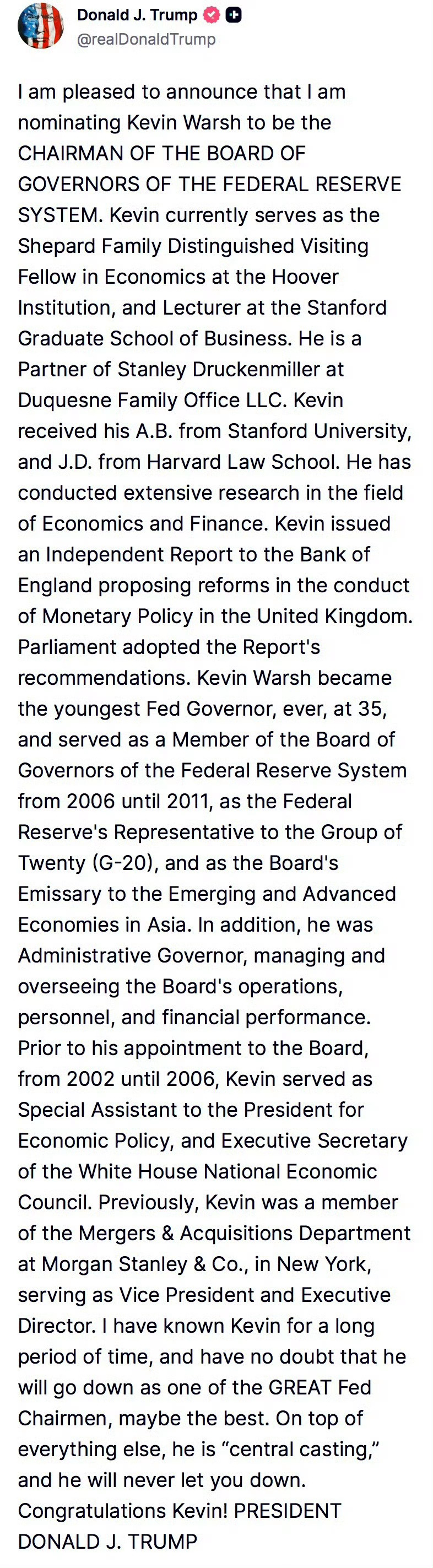 Trump提名Kevin Warsh为美联储主席昨天白银最高升破120,黄金升破5600,今天白银最低跌破100,黄金跌破5000Kevin Warsh: 怪我洛,我还没坐上美联储主席的位置金银就崩了刻舟求剑一下,每次新的美联储主席提名公布后一段时间内,美债收益率都是先走高的,意味着美元汇率暂时稳住并走高,利空大宗商品走势。叠加市场认为Trump 对伊朗有TACO的可能,因为昨晚伊朗公布周末将在霍尔莫兹海峡进行实弹演习后,Trump喊话“计划同伊朗对话希望可以不动武”,也利空金银~但要区分美联储新主席刚获提名后的一段时间美债收益率走高,带动美元汇率走强,利空大宗商品走势,和真正的趋势!!!