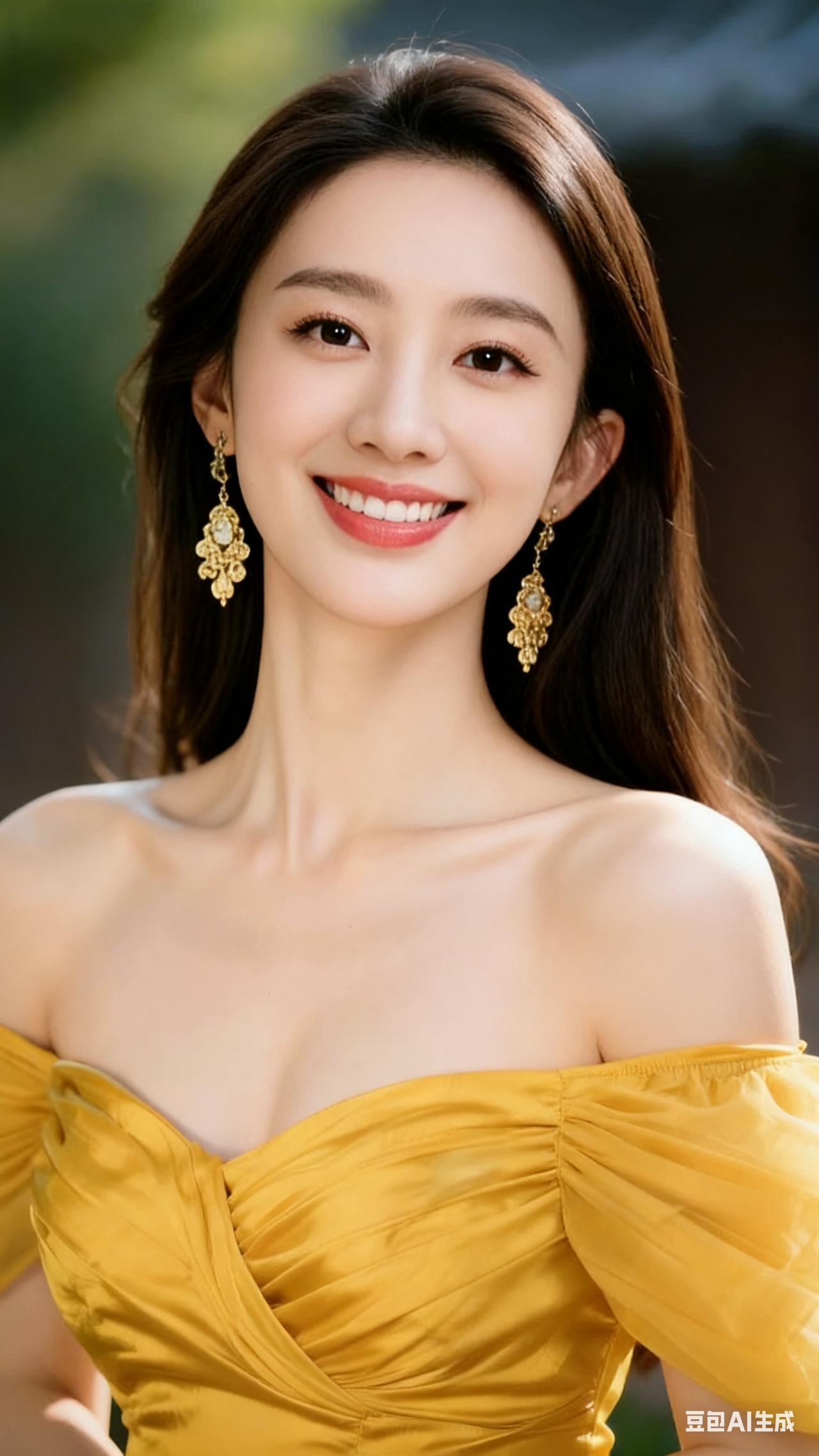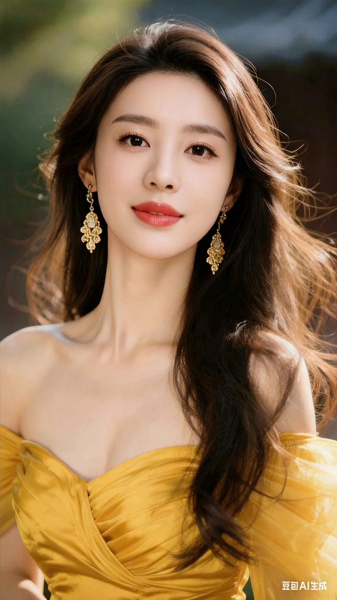优雅气质,黄金耳环点缀,黄色礼服闪耀,完美女神范儿!💃💍✨