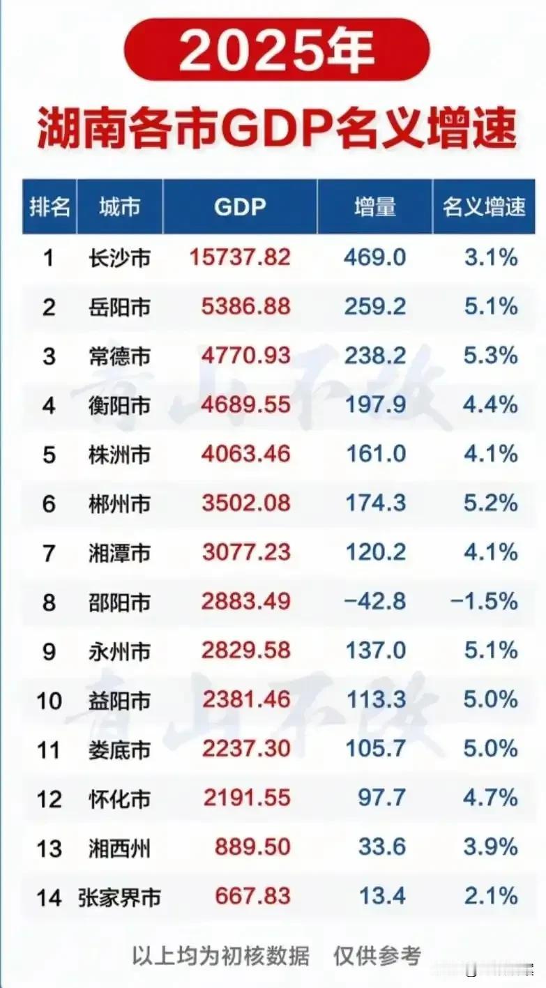 长沙GDP终于公布了!本来都以为长沙在憋大招,没想到拉了个大的。居然连1.6万亿都没破,彻底和福州、郑州坐一桌去了。前面青岛、无锡的车尾灯都看不到了。 湖南这些年一直着力推动强省会战略,其他所谓的长株潭一体化、省域副中心建设,都是为强省会战略服务的。 如今,长沙交出这样一份成绩单,是时候调整一下湖南的城市发展战略了。湖南GDP排名 长沙 长沙排行 湖南经济排名