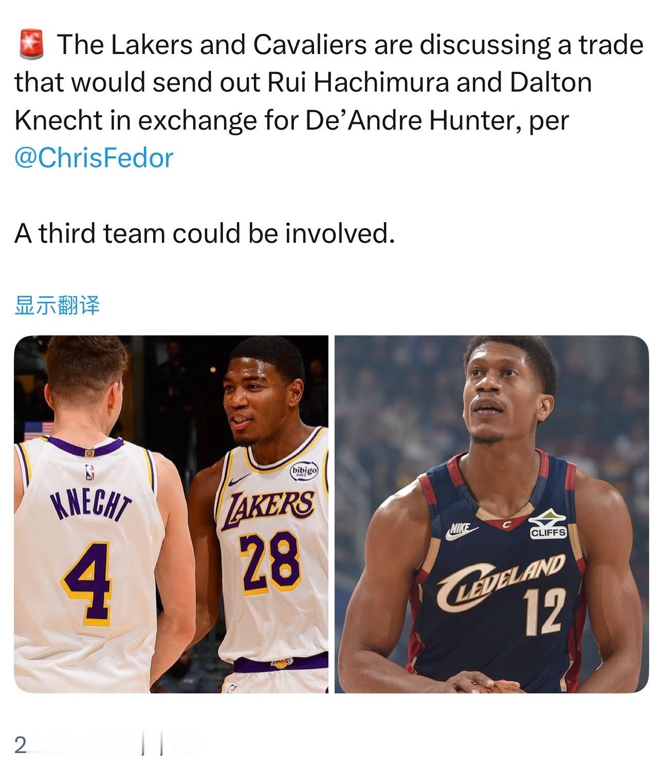 据骑士记者Chris Fedor报道,湖人和骑士正在商讨一笔交易,将送出八村塁和克内克特,换来德安德烈·亨特,可能会有第三方球队加入。