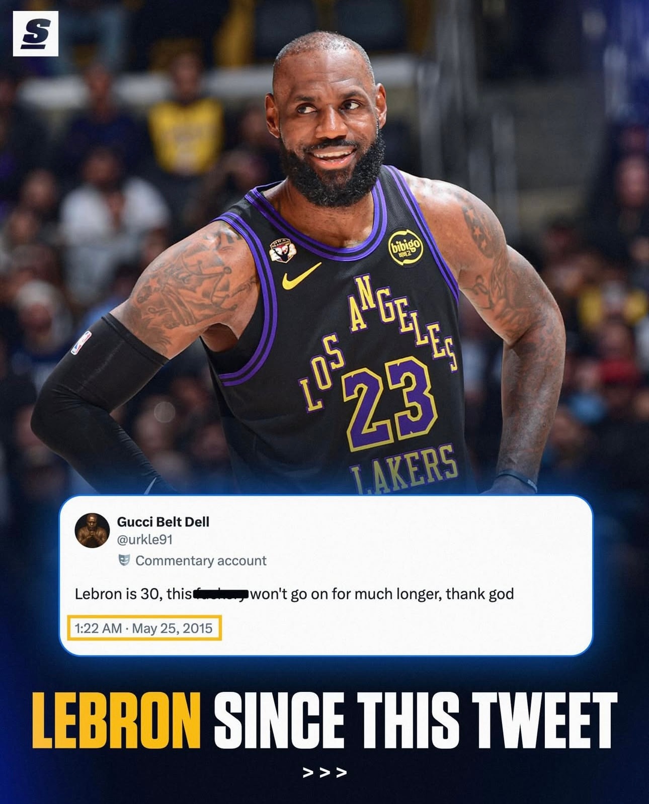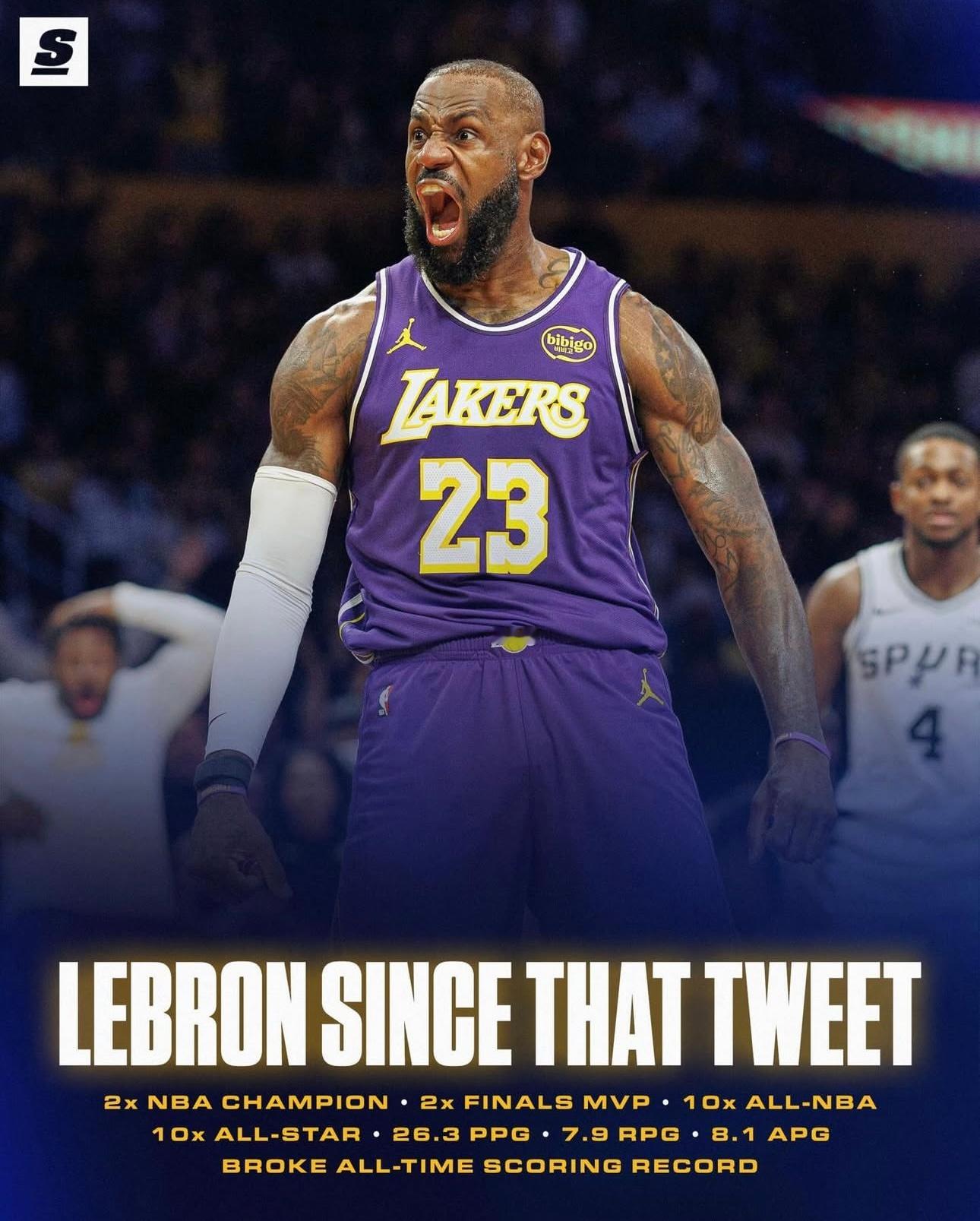 自从2015年5月25日有人在推特上说詹姆斯30岁不行了以后,詹姆斯拿了两个总冠军,两个FMVP,10次入选赛季最佳阵容,10次入选全明星,场均26.3分7.9篮板8.3助攻,并且成为了历史总得分王。