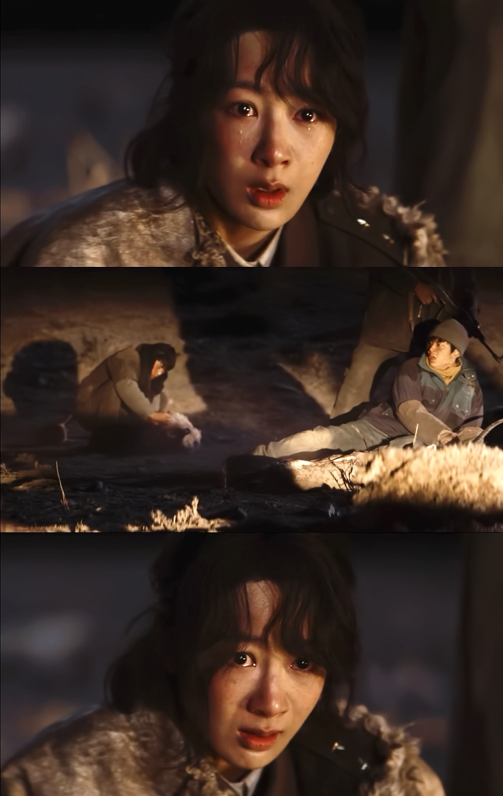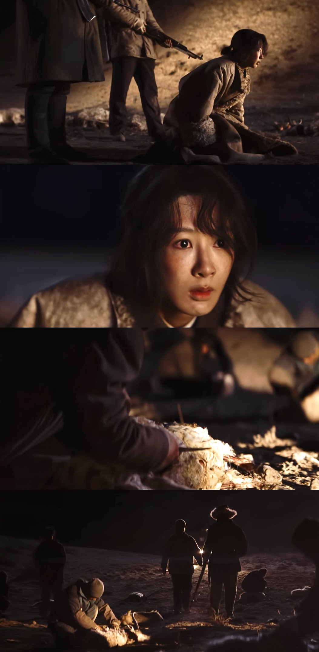 一开始大家或许都对这个生态保护的题材有些云里雾里,高原上的故事离我们太远了。于是白菊和东智巴遇上盗 猎 份 子的情节作为第一场重头戏就尤其重要——它直接的,深刻的,甚至是残忍的揭露了盗 猎 份子 的丑恶,这些人逆着光蒙着面走来,有一瞬间你甚至分不清它们究竟是人还是魔鬼。尤其这场戏还加入了白菊和弟弟的亲情线,生死关头是误入歧途的弟弟冲出来保护她,而后又因为无知和恐惧弃她而去,多讽刺啊。