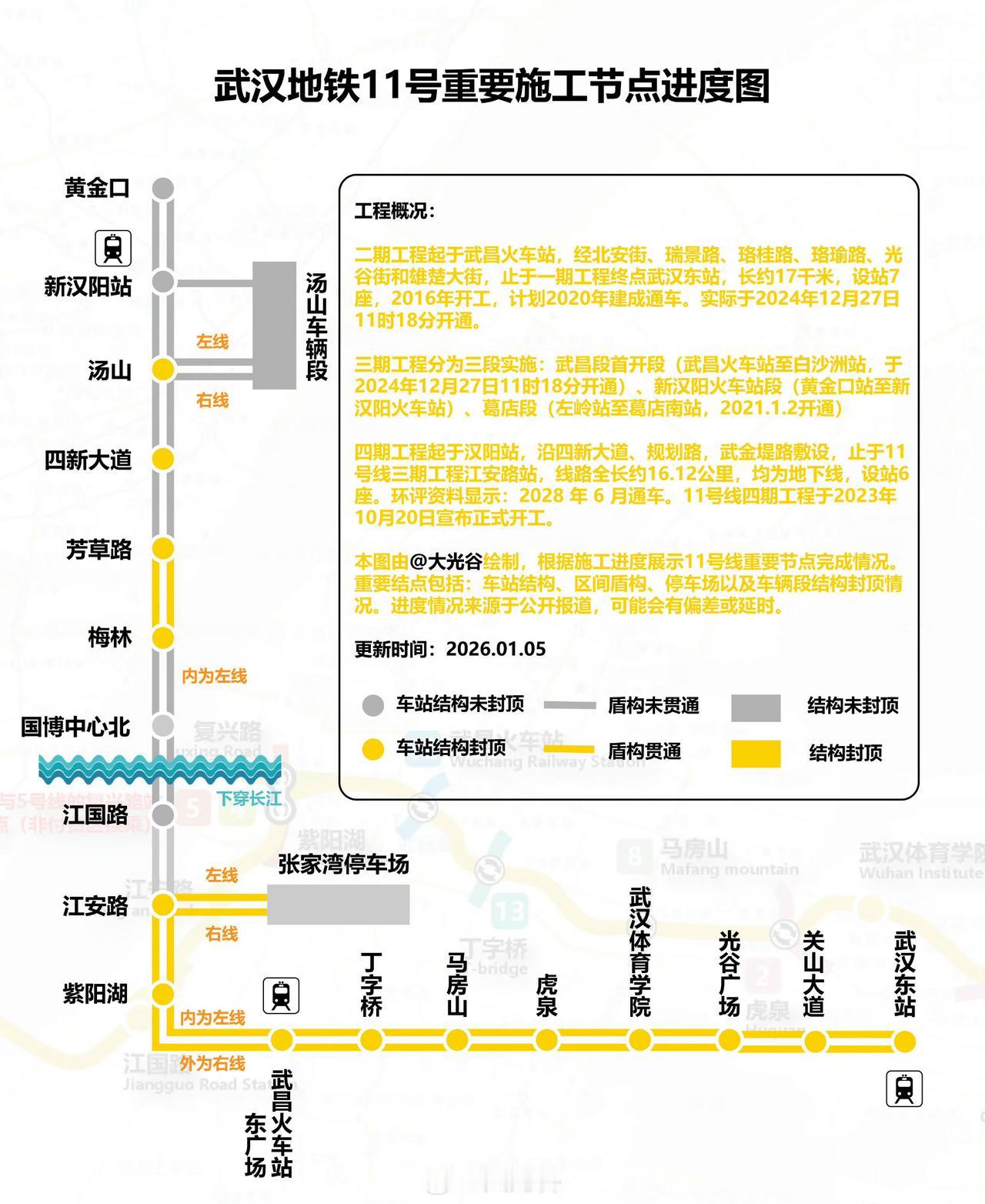 11号线四期工程过江段盾构始发 1月29日,武汉地铁11号线四期工程江国路站至国博中心北站越江区间(江国区间)盾构正式始发,标志着这条武汉第八条越长江地铁隧道进入掘进阶段。全长约4.26公里(含长江水域段约2公里),单洞双线设计,为全线控制性工程。施工团队为12号线越江区间原班人马。 11号线四期全长16.2公里,设6座地下站;目前4座车站主体封顶,2个盾构区间贯通。线路将串联汉阳高铁站、四新副中心和武昌白沙片区,预计2028年6月开通。@鹏程万里-汉12早日开通
