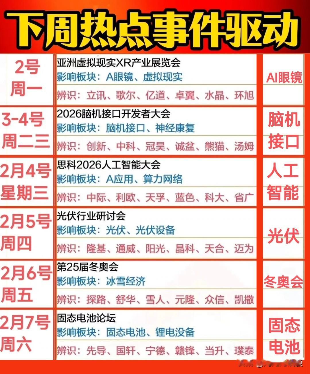 下周热点事件汇总,相关赛道标的值得提前布局…… 周一:AI眼镜-虚拟现实 周二/三:脑机接口 周三:人工智能 周四:光伏及设备 周五:冬奥会(冰雪经济) 周六:固态电池 关注“刘姥姥”,精彩分享真不少(麻烦亲们:点赞,收藏,分享)。 特别提醒:本文涉及内容及个股,仅供交流与参考,不是荐股,不得以此作为买卖依据,盈亏自负。