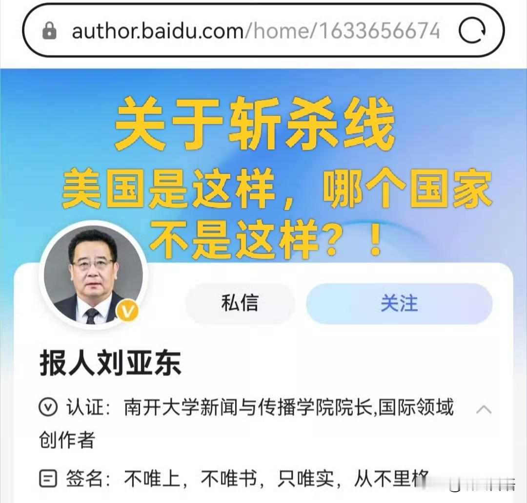关于牢A的斩杀线,又一位名人出来喊话了。“美国是这样,哪个国家不是这样?!” 这位顶着南开大学新闻与传播学院院长,国际领域创作者头衔的名人,洋洋洒洒写了上千字,旁征博引,文采了得。其实全文总结就一句话:不否定斩杀线,但是“哪国都一样”!这句话足以载入东大新闻与传播学的史册。 看来一个牢A戳了不少人的肺管子啊!