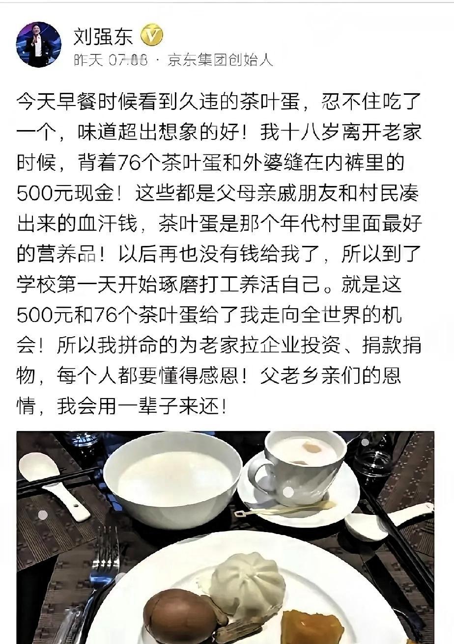 刘强东又发文了! 1月29日他回到家乡光明村,为村民送上超万件年货,后续发文还特意提到老家的茶叶蛋,直言味道超出预期,简单的话语里,满是对故土和乡情的惦念。 相信大家都熟知他的那段过往,十八岁离开老家时,行囊里装着76个茶叶蛋,外婆还把凑来的500元现金缝在内裤里。那笔钱是父母、亲戚和村民一分一毛凑的血汗钱,茶叶蛋在那个物资匮乏的年代,已是最好的营养品,这份温暖,也成了他刻在心底的记忆。 如今的他带领京东走到了更广阔的舞台,却从未放下家乡的父老乡亲。逢年过节回乡探望、为乡亲办实事送物资,早已成了他的常态,这次的超万件年货,不过是他多年反哺家乡的一个缩影。他曾说,乡亲们的恩情要用一辈子来还,而他也始终用行动践行着这份承诺。 在当下,不少人在获得成就后容易忽略来路,而刘强东始终守着那份初心,把乡情和感恩放在心上。这份对故土的牵挂,不是一时的形式,而是长久的真心,无关名利,只是单纯记着曾经的帮扶与温暖。 其实真正的成功,从来都不只是拥有多少财富,更在于始终保持本心,懂得珍惜和回馈。这份朴实的感恩之心,也让人们看到了最珍贵的品质。
