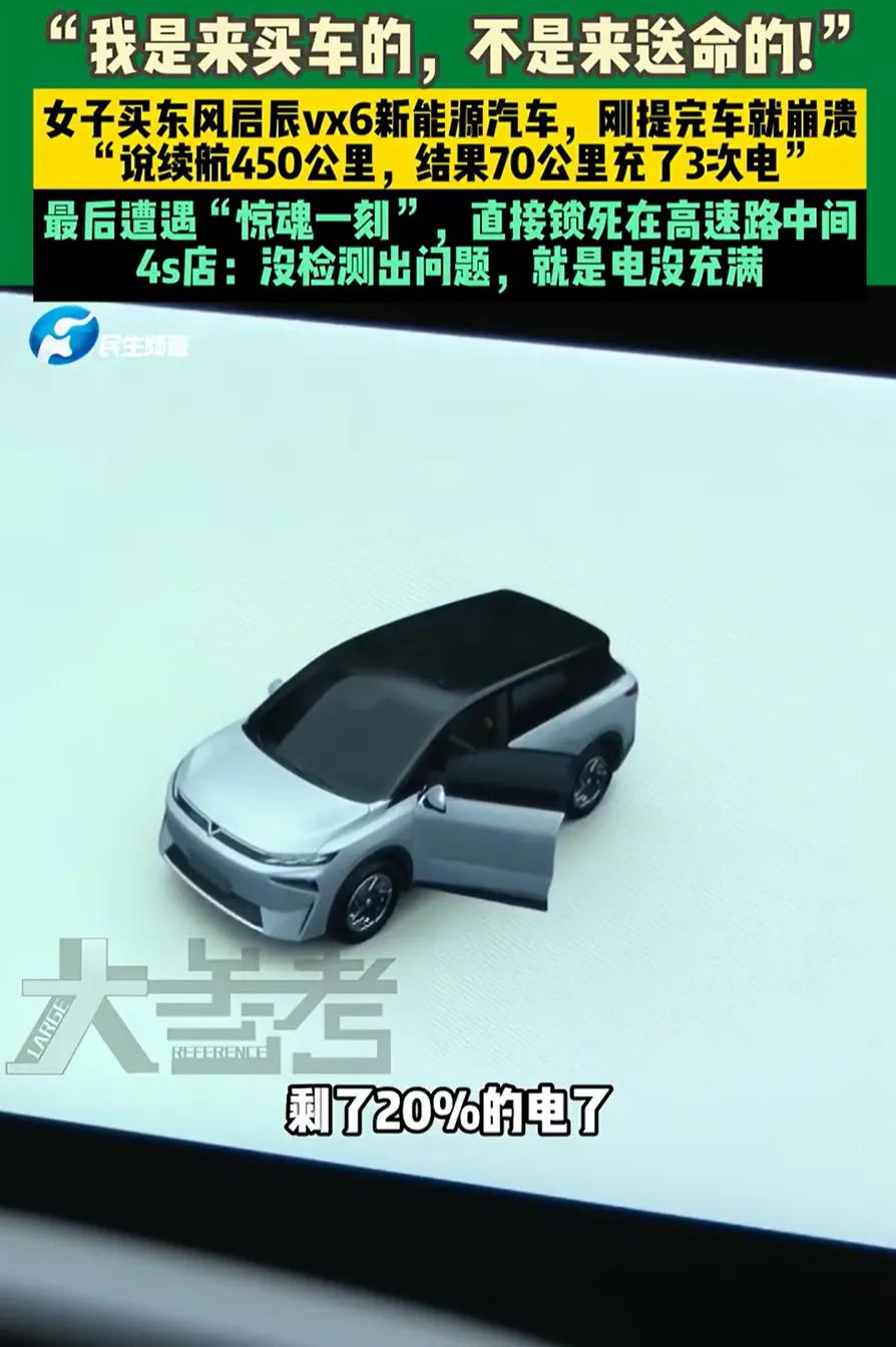 “我快吓死了!再也不敢开了!”河南郑州一位女士的新能源汽车提车经历,堪称一场惊魂噩梦 满心欢喜提车,官方标称450公里续航,结果提车当天仅开70公里,就接连充了3次电,甚至在高速晚高峰直接趴窝在路中间,女士当场崩溃:“我是来买车的,不是来送命的!” 这位女士此前满心期待定下这台新能源汽车,盼了许久终于等到提车日。一大早她就兴冲冲赶到门店,顺利办完所有手续,全程笑意盈盈,满脑子都是开着新车高速回家的美好画面。 门店工作人员更是拍着胸脯保证,车子已充至97%电量,官方续航450公里,跑高速回家绰绰有余,让她放心上路。 可刚开出门店没多久,女士就发现了不对劲——车子的电量掉得快得离谱,仪表盘上的数值几乎几百米就跳一格,97%的电量肉眼可见地飞速下滑,和新车该有的续航表现天差地别。 原本的喜悦瞬间被不安取代,她不敢开快,只能小心翼翼龟速前行,心里不停祈祷电量能撑得久一点。 没驶出市区,车子电量就跌到20%,警示灯疯狂闪烁。万幸的是,她勉强开到就近充电桩,在彻底断电前停在了安全区域,这是提车后的第一次充电。 女士还自我安慰,或许是新车首电“太虚”,充满后就能恢复正常,可这只是噩梦的开始。 充至99%再次出发,刚上高速,电量就重蹈覆辙,依旧飞速下降。女士全程心惊胆战,隔几秒就看一次仪表盘,最终只能在高速服务区紧急二次充电,此时全程还没开到70公里。 她立刻联系门店反映续航虚标问题,工作人员远程指导了简单调整,称调整后电量下降会变慢,让她再试试。 半信半疑充好电第三次上路,电量掉速确实稍缓,女士刚松了口气,意外却猝不及防发生了。 当时已是晚上六七点钟,高速正值晚高峰,车流量大、车速快,车子仪表盘明明显示还有60%电量,却突然失去动力,直接停在了高速路中间! 那一刻,女士浑身冒冷汗,恐惧瞬间将她包裹。高速路中间车流疾驰,稍有不慎就可能引发严重交通事故,她脑子一片空白,赶紧下车在车后做好警示,焦急联系门店和拖车,直到拖车赶来,悬着的心才稍稍放下。 本以为拖回门店后能得到合理的解释和解决方案,可门店工作人员的检测结果,让女士彻底破防——对方称“没有检测出任何问题,只是车子当时没充满电”。 一句轻飘飘的“没检测出问题”,怎能抹平女士的惊魂经历?作为普通消费者,相信官方标称、信任门店专业,花真金白银买车,图的是方便省心,结果却遭遇续航严重虚标,提车当天就高速趴窝,险些危及生命。 门店这种敷衍塞责的态度,不仅是对消费者的不负责任,更是对自身产品和品牌的漠视。 目前这位女士仍在和门店协商处理此事,我们也希望涉事门店能拿出应有的担当,认真排查车辆问题,给消费者一个合理的解决方案和满意的答复。 毕竟消费者的信任来之不易,别让掺水的续航、敷衍的服务,凉了广大新能源汽车消费者的心,最终砸了自己的招牌。