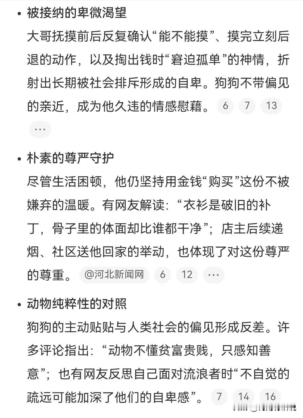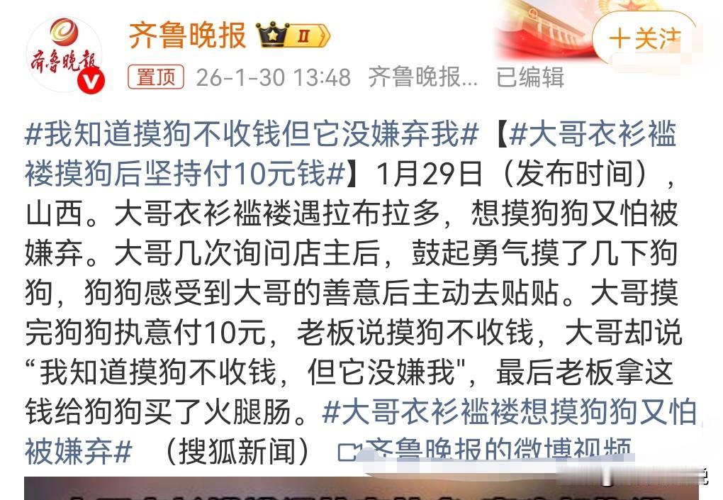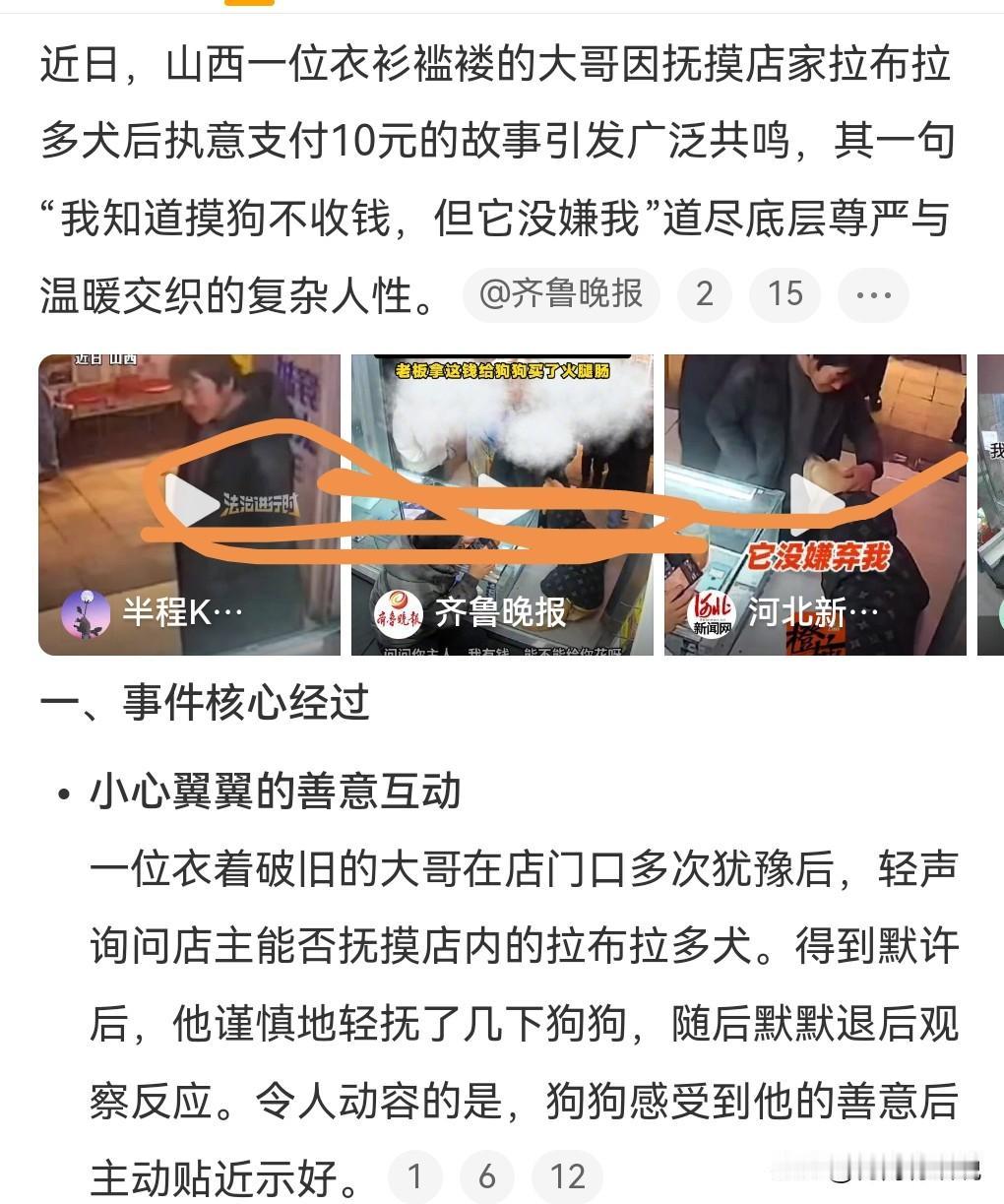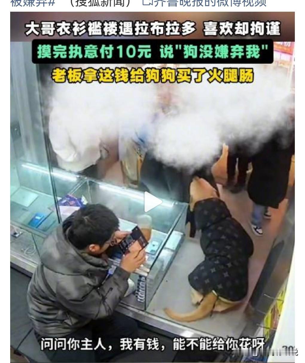 有的人也许需要的只是尊重而已。 近日,大哥衣衫褴褛摸狗后坚持付10元钱。 一男子衣衫褴褛,偶遇拉布拉多。 问店主能不能摸摸狗?店主说可以。 男子摸的时候,这狗主动贴近。 这让他可能十分的感动,说这狗不嫌弃他,说什么也要给这狗10块钱。 店主说摸狗不收钱。 大哥说我知道摸狗不收钱,但是它不嫌弃我。 最终店主拿着10块钱给狗买了火腿肠。 男子平时没多少人看得起他,但是这次他感受到了狗的善意,心里肯定是十分的感动的。 店主最后还通过社区还联系上了男子的家人,让男子回家了。 这真是好事一件。