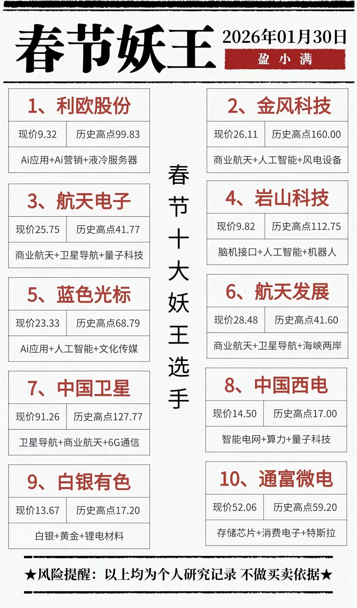 2026年1月30日,春节妖王选股指南,十大潜力股揭晓! 春节妖股盘点:利欧、金风涉足AI与风电,航天电子聚焦脑机接口,中国西电布局量子科技,通富微电押注芯片锂电。