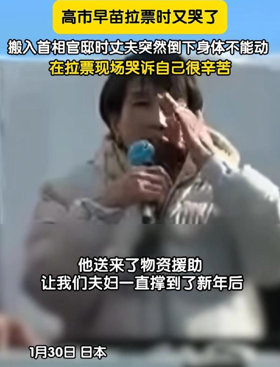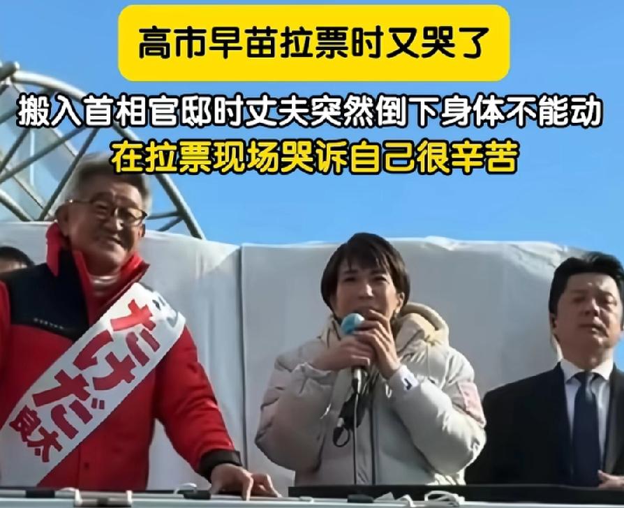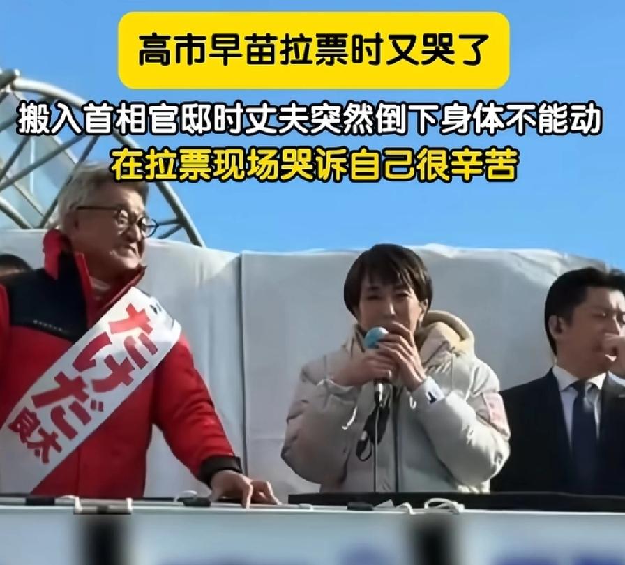 高市早苗拉票时,又抹鼻子哭了!诉苦诉得旁边的红衣服同事,都笑了,这是听不下去了!高市说自己当选首相后,搬入首相官邸,搬家时丈夫都倒下了,自己很辛苦!这也太假了,堂堂首相没有专门搬家人员吗?还用自己和老公动手搬家搬东西?而且为了工作都不考虑丈夫的身体,这还想博同情?高市这逻辑,真是服了,说得自己都不信!